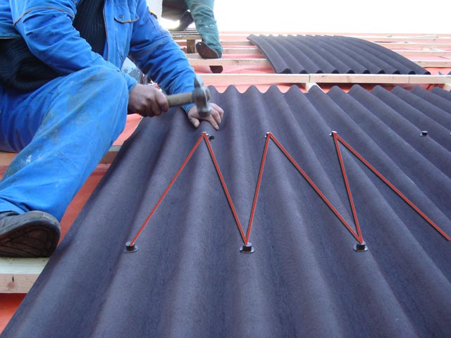 Традиционно битумную черепицу укладывают на полностью подготовленную сплошную обрешётку, причём плитки начинают укладывать снизу, от свеса крыши и ряд за рядом движутся к коньку. Для работы используют уложенные на кровлю лестницы.