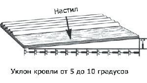 ![]() | 2. При угле наклона крыши от 10° до 15° (уклон от 1/6 до 1/4) делается обрешетка с интервалом 450 мм по осям. Концевой нахлест: 200 мм Боковой нахлест: 1 волна. |