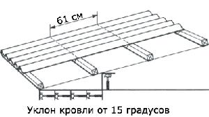 | 3. При угле наклона крыши от 15° и более (уклон от 1/4 и менее) делается обрешетка с интервалом 600 мм по осям. Концевой нахлест: 170 мм, Боковой нахлест: 1 волна. |