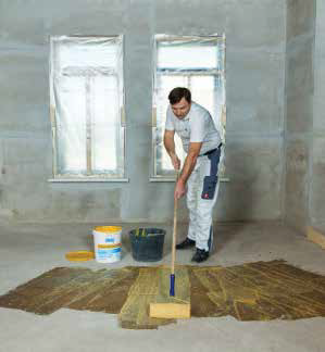 Выравнивающая стяжка толщиной от 30 до 60 мм на разделительном слое из подкладочной бумаги применяется, когда основание пола плохо подготовлено (имеются масляные пятна, грязь, небольшие трещины) или не подходит под заливку контактным способом, например, если основанием является деревянное перекрытие.
