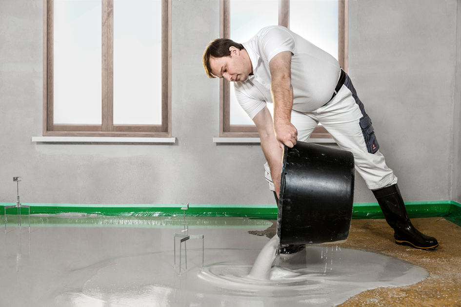 Заливка – самый занимательный и динамичный процесс при устройстве стяжки. К нему смело можно привлечь друзей – так процесс пойдет не только веселее, но и быстрее. Не забудьте про резиновые сапоги – они понадобятся для передвижения по заливаемым полам. Площадь заливки нужно планировать таким образом, чтобы успеть нанести и разравнять смесь в течение одного часа. Увеличение количества участников заливки и инструмента для перемешивания и разравнивания стяжки КНАУФ-Трибон приведёт к желаемому результату – ровному полу - быстро и качественно. КНАУФ-Трибон можно замешивать по два мешка одновременно, при этом количество воды увеличивается пропорционально, что значительно ускоряет процесс. Заливку следует вести от дальнего угла помещения, постепенно продвигаясь к выходу. Заливку прекращают по достижении обозначенной отметки пола, после чего разравнивают смесь с помощью рейки или щётки с жёсткой щетиной. Такая обработка позволит выгнать пузырьки воздуха из стяжки, тем самым уплотнив её, и окончательно разровнять поверхность нового пола. Все готово! Остаётся вымыть инструмент и дождаться схватывания стяжки.