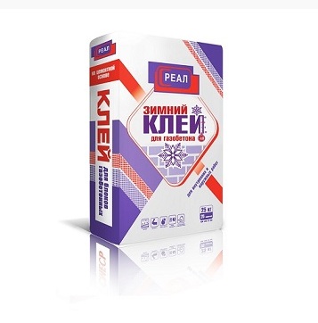Зимний клей для газобетона марки РЕАЛ - состав, на основе цемента, который используется при возведении стен из газобетона, пенобетона и для выравнивания поверхностей, при отрицательных температурах (до -10*С). Применяется для внутренних и наружных работ.