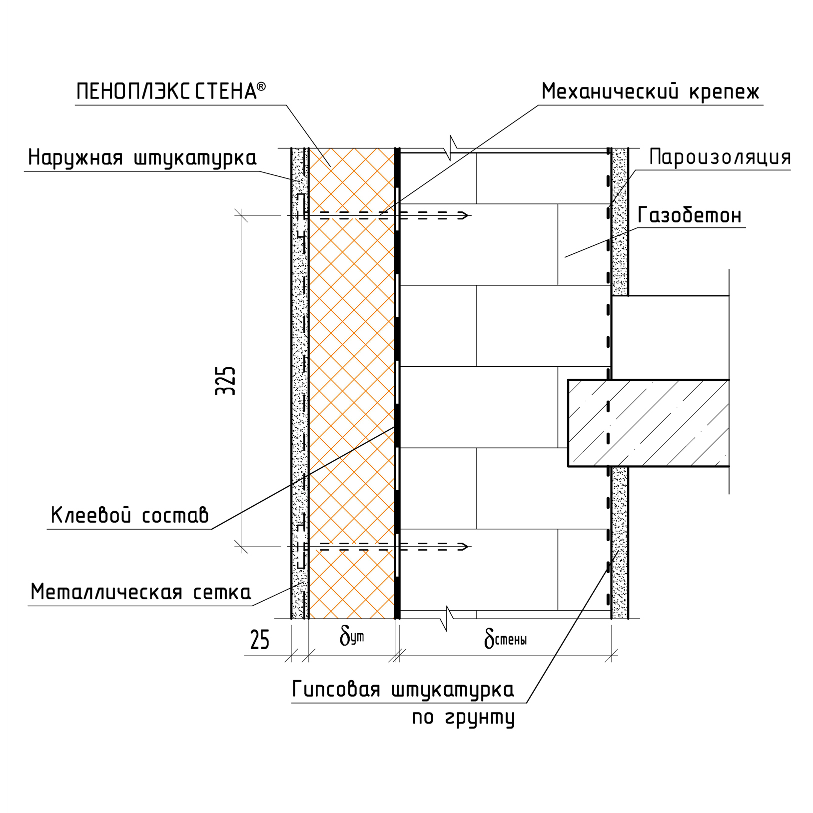 Наружная стена здания (пароизоляция – газобетон – ПЕНОПЛЭКС СТЕНА® - штукатурка по металлической сетке)