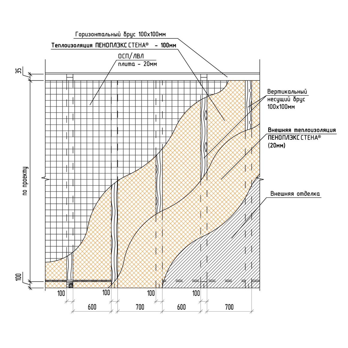 Жесткость стены обеспечивается краевыми и несущими балками, которые составляют единый несущий каркас, а пространство между балками заполняется утеплителем. Шаг несущих деревянных балок выбирается согласно расчету по нагрузкам, под габариты теплоизоляционных плит ПЕНОПЛЭКС СТЕНА®: ширина 600мм, длина 1200мм.