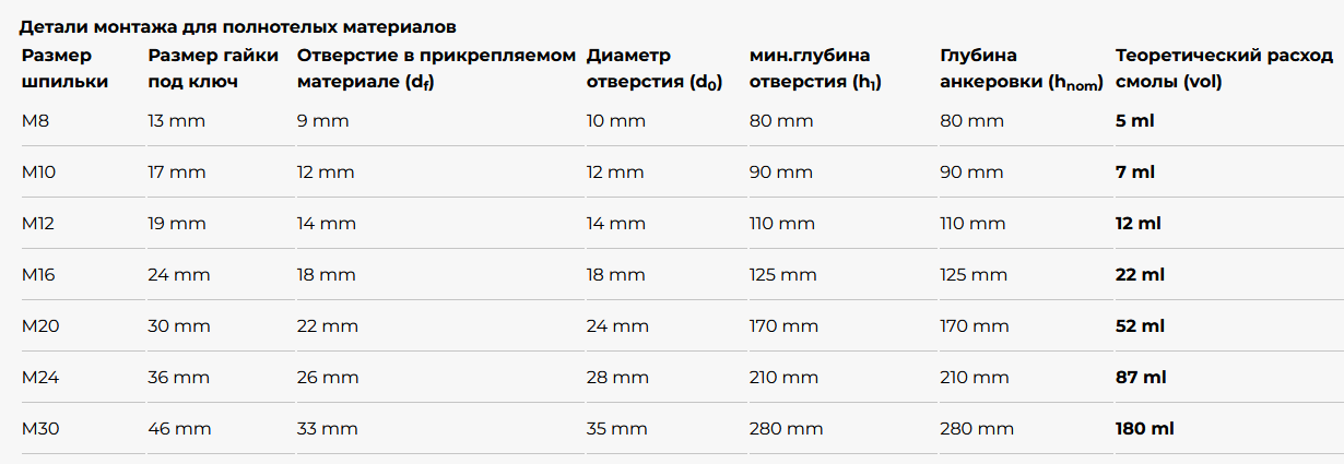 Быстрозастывающая, двухкомпонентная морозостойкая инжекционная масса без стирола на основе винилэстера для использования в холодных зимних условиях. Подходит для монтажа крепления стальных конструкций и арматурных стержней, устанавливаемых в бетонные фасады, ограждений, опорных пластин, работы с пустотелыми и полнотелыми материалами (бетон, керамзит, камень, кирпич). Монтаж можно производить близко к краю и с малыми расстояниями между точками креплений. Можно хранить и использовать при температуре до -20 °C. Условия применения зависят от качества материала шпильки или арматуры: • оцинкованный - для сухих помещений и временных креплений на улице; • горячеоцинкованный/MG и A2 - для сухих и влажных помещений, на улице (только в сельской местности); • A4 - в помещении, на улице и в индустриальной зоне; • HCR - для особо агрессивных условий.