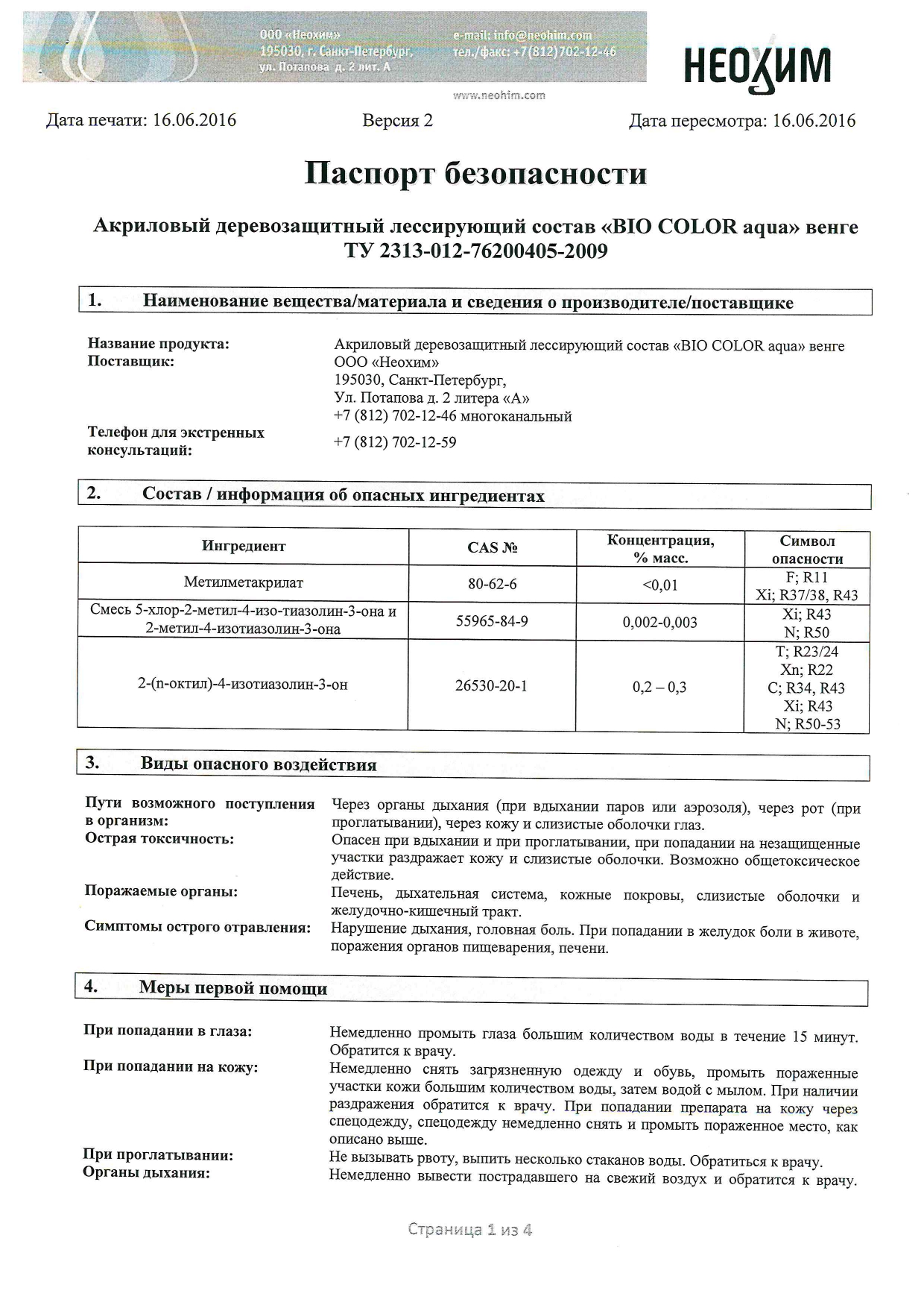 - При попадании состава на кожу или в глаза промыть большим количеством воды.