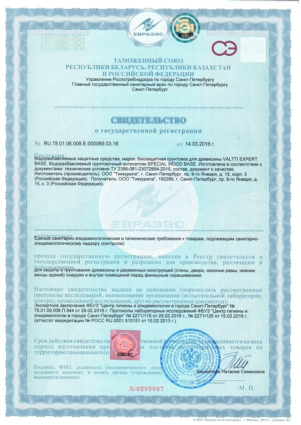 Окраска: Окрашиваемая поверхность должна быть сухой и чистой, влажность древесины должна быть менее 40%. Во время окраски и высыхания температура воздуха, грунтовки и поверхности должна быть не ниже +5°C и относительная влажность воздуха – не выше 80 %. Поверхность обработать грунтовкой «Valtti Expert Base» на возможно ранней стадии строительства. Грунтовку перед применением тщательно перемешать. Наносить на сухую поверхность кистью, тампоном или окунанием в 1-2 слоя. Торцы пропитать до насыщения. Финишную окраску произвести как можно быстрее, но не ранее, чем через 12 часов после грунтования. В случае, если окраска задерживается, грунтование рекомендуется повторить грунтовкой «Valtti Expert Base».