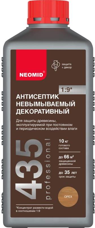 «NEOMID 435 Антисептик невымываемый» для наружных и внутренних работ, придает древесине благородный коричневый оттенок. Подчеркивает естественную структуру древесины.
