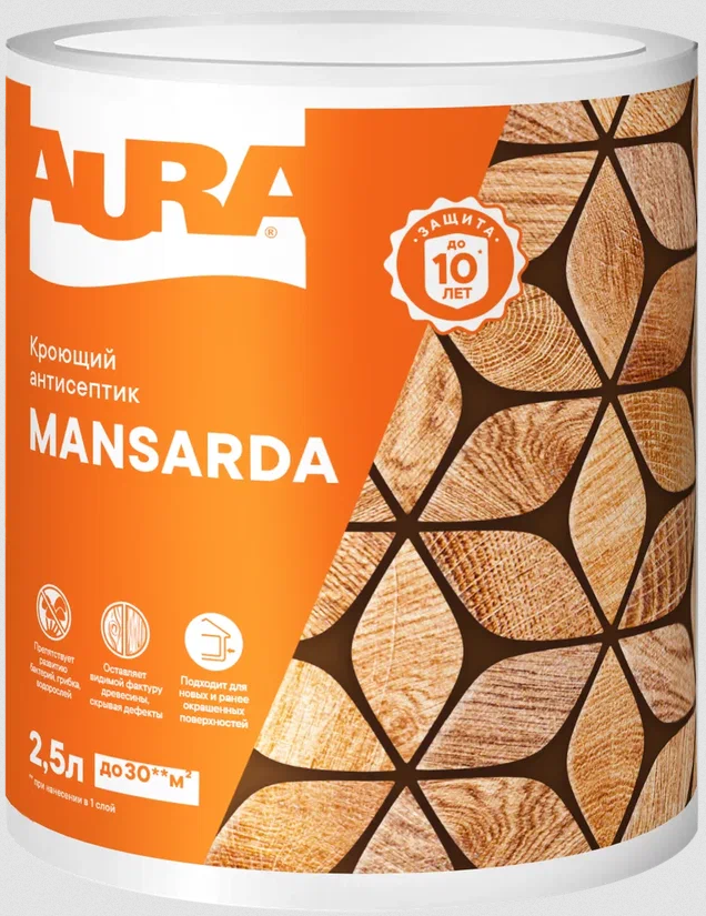 Кроющий антисептик Aura Mansarda используется для отделки и защиты деревянных фасадов, беседок, заборов. Подходит для новых и ранее окрашенных поверхностей, защищает древесину от биологических повреждений, УФ-излучения, благодаря входящей в состав восковой добавки, обработанная, поверхность отталкивает загрязнения и влагу. Линейка высококачественных продуктов Aura Mansarda (Мансарда) разработана специально для российских условий. Применение антисептиков этой марки обеспечит минимальный уход за деревянным фасадом и сохранит привлекательный внешний вид на долгие годы. Кроющий антисептик Аура Мансарда создает на поверхности покрытие, скрывающее рисунок, легко наносится и не оставляет подтеков. Не подходит для горизонтальных поверхностей. Для максимально эффективной защиты необходимо комплексное использование биозащитной грунтовки Aura Fasad Grund и кроющего антисептика Mansarda. При соблюдении технологии нанесения срок службы покрытия не менее 10 лет. Цвет: белый. Колеровка: Колеруется в пастельные и насыщенные цвета. Колеровка по системе Eskarocolor (база А, TR). База А - колеруется в светлые оттенки, может использоваться без колеровки. База TR - колеруется в темные, несыщенные тона, исользовать только с колеровкой. Расход: Строганая древесиная 9-12 м?/л. Пиленая древесина 4-6 м?/л Расход состава зависит от типа и подготовки поверхности и способа нанесения. Время высыхания: От пыли – 1-2 часа, для нанесения следующего слоя – не менее 4 часов при температуре +(20±2)°C и относительной влажности воздуха (65±5)%. При уменьшении температуры или увеличении влажности время высыхания соответственно увеличивается. В течение последующих 2 суток беречь покрытие от воздействия влаги. Подготовка поверхности перед окраской: Обрабатываемая поверхность должна быть сухой (влажность не более 20%), очищенной от пыли и жирных пятен. Для максимальной защиты предварительно использовать грунт Aura Fasad Grund. Нанесение: Перед применением обязательно тщательно перемешать. Наносить при температуре воздуха, поверхности и самого продукта от +10°С до +30°С и относительной влажности воздуха не выше 80 %. Запрещается проводить окрасочные работы во время дождя, тумана или измороси. Особенно тщательно обрабатывать торцы. Наносить не менее 2 слоев кистью по направлению волокон древесины или распылением. При необходимости перекрасить темный цвет в более светлый, для южного и западного фасада оптимально 3-х слойное нанесение. Рабочие инструменты: Кисть с синтетическим ворсом, распылитель.