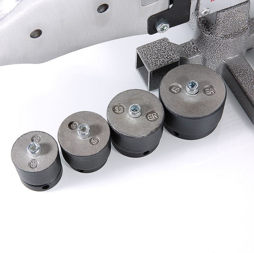 Нагревательная панель и сменные насадки изготовлены из алюминиевого сплава, насадки имеют антиадгезионное покрытие (тефлон).Если во время сварки разогретый материал трубы или фитинга регулярно остается на сварочных насадках, это означает износ тефлонового покрытия, и такие насадки подлежат замене на новые.