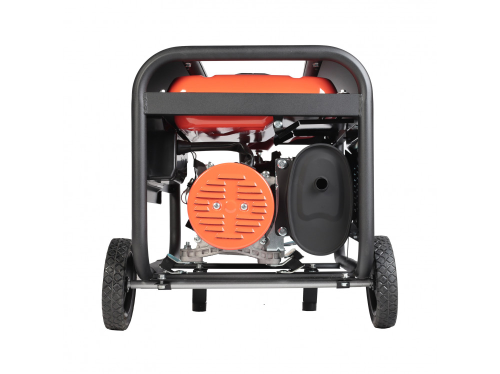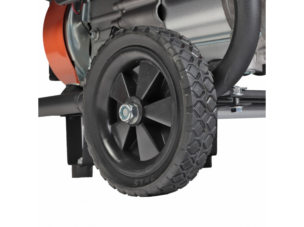 Удобство транспортировки: Два больших обрезиненных колеса обеспечат плавный ход генератора по любой поверхности, делая его перемещение простым и удобным.
