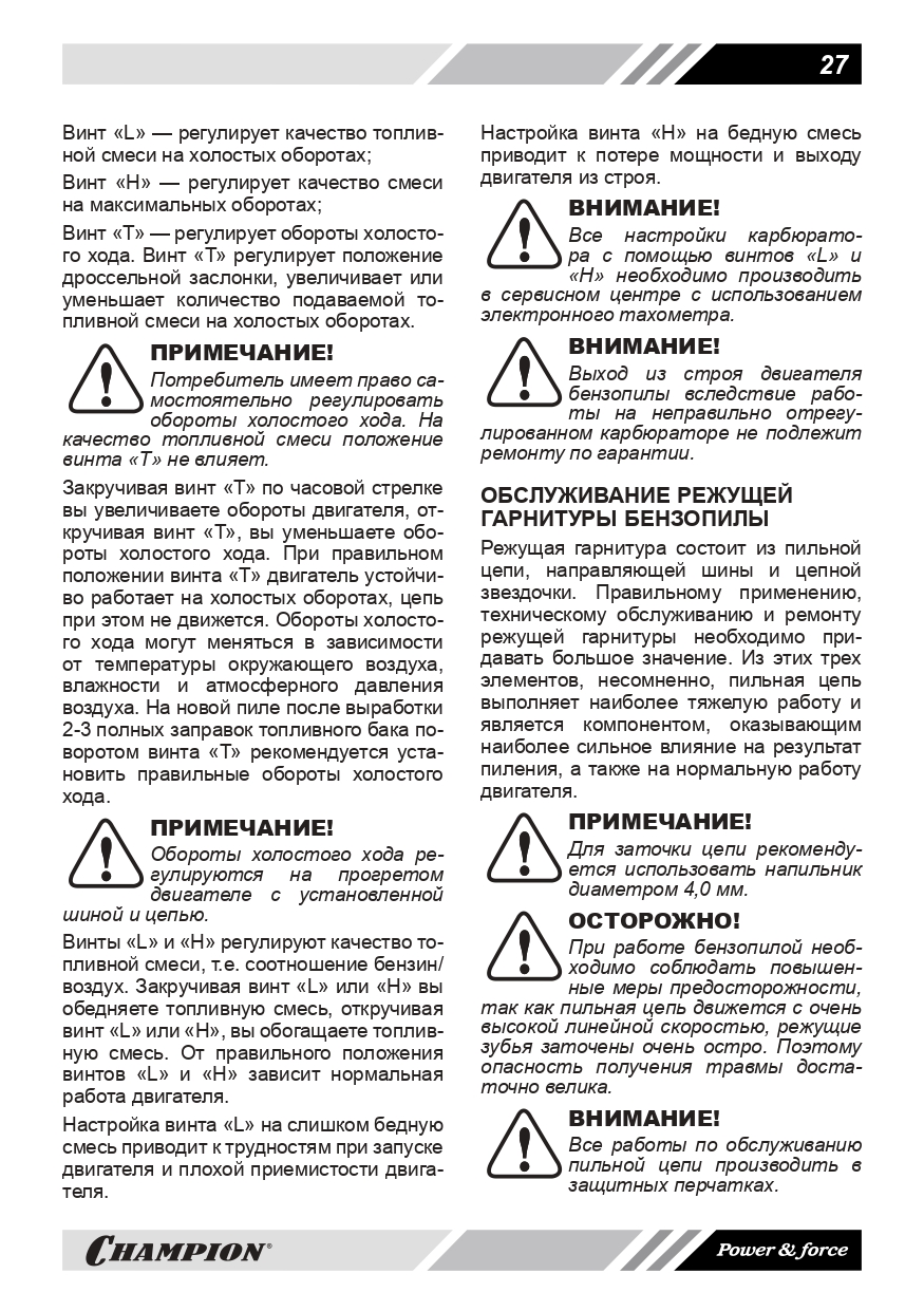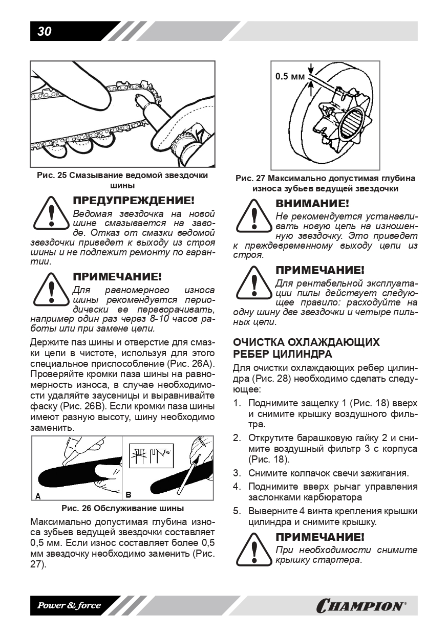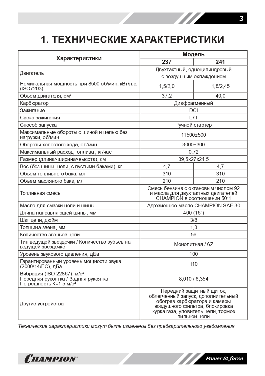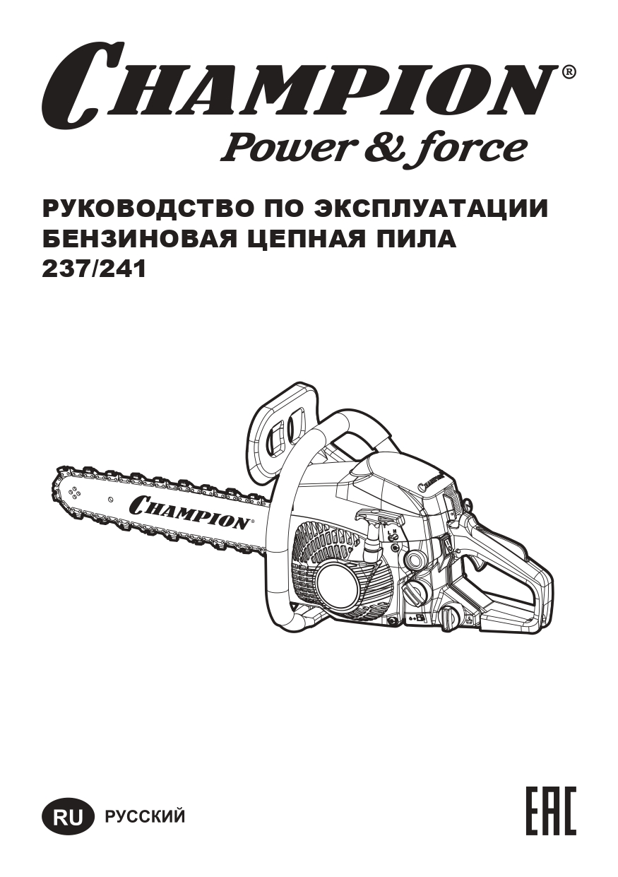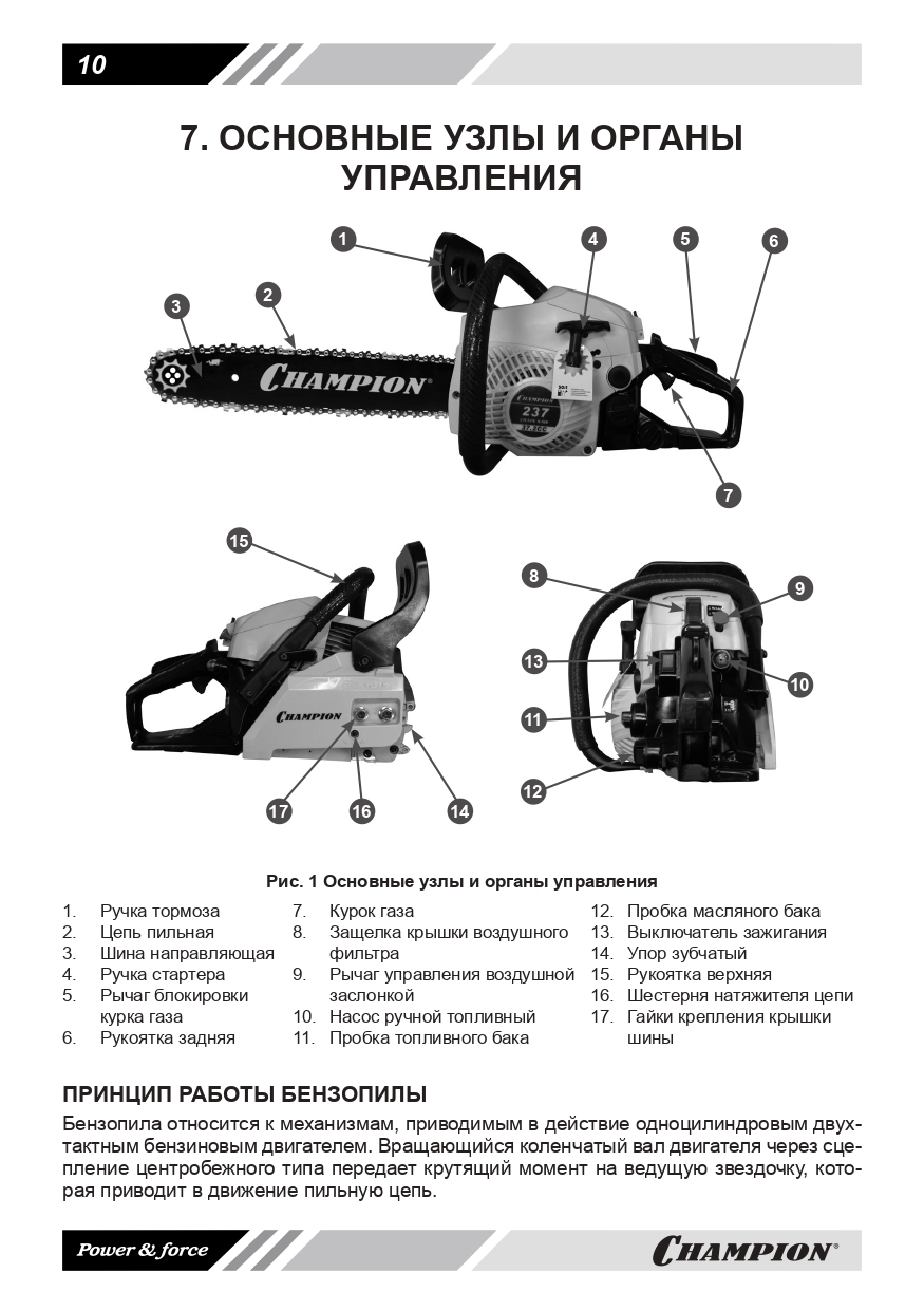 Бензопила Champion-237 предназначена для распила древесины.Относится к разряду пил, предназначенных для бытового применения. Двигатель 2-х тактный с воздушным охлаждением. Заправляется бензином АИ-92+ маслом для двухтактного двигателя.Рекомендуется смазывать цепь и шину маслом для снижения трения между ними, что увеличит срок службы пильной гарнитуры.