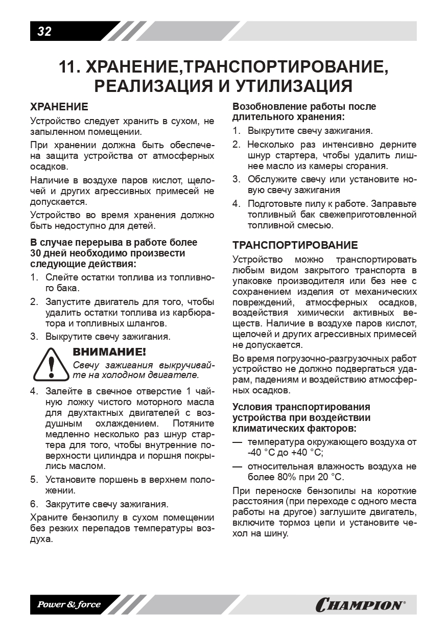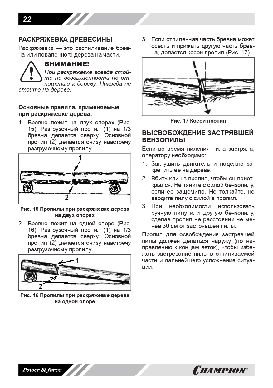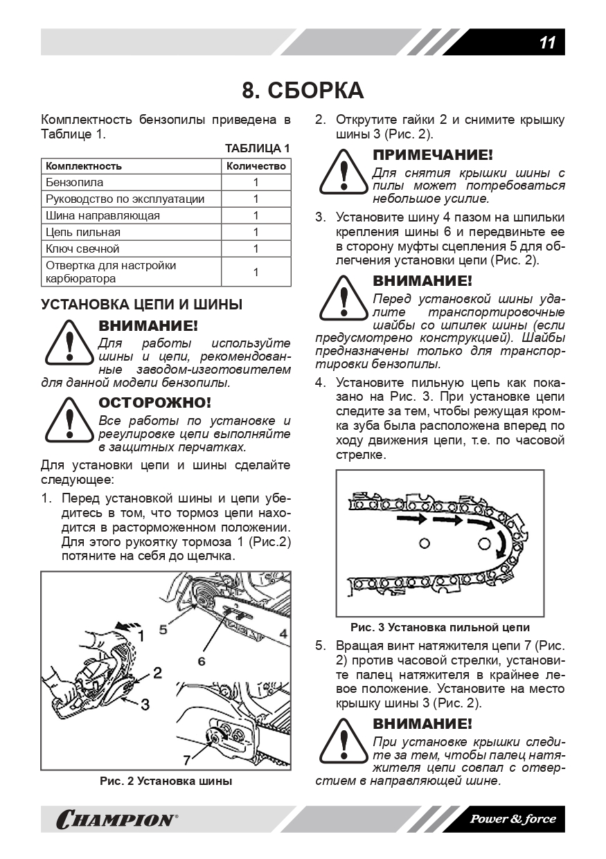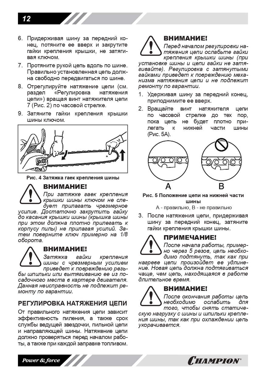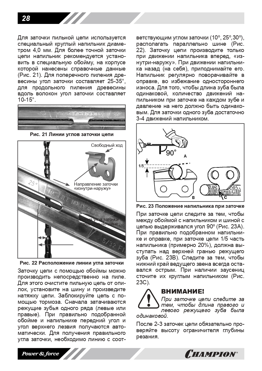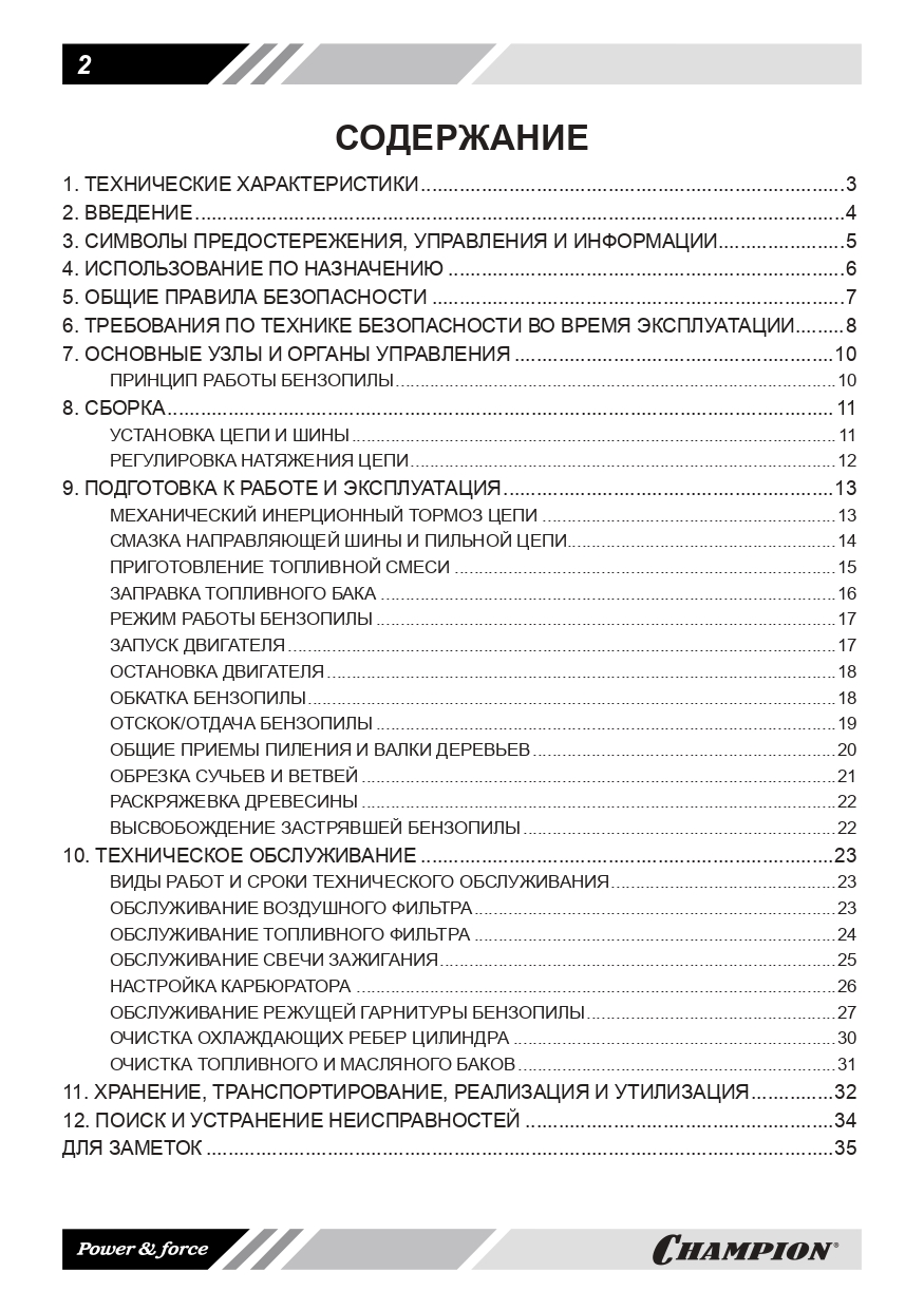 Бензопила Champion-237 предназначена для распила древесины.Относится к разряду пил, предназначенных для бытового применения. Двигатель 2-х тактный с воздушным охлаждением. Заправляется бензином АИ-92+ маслом для двухтактного двигателя.Рекомендуется смазывать цепь и шину маслом для снижения трения между ними, что увеличит срок службы пильной гарнитуры.