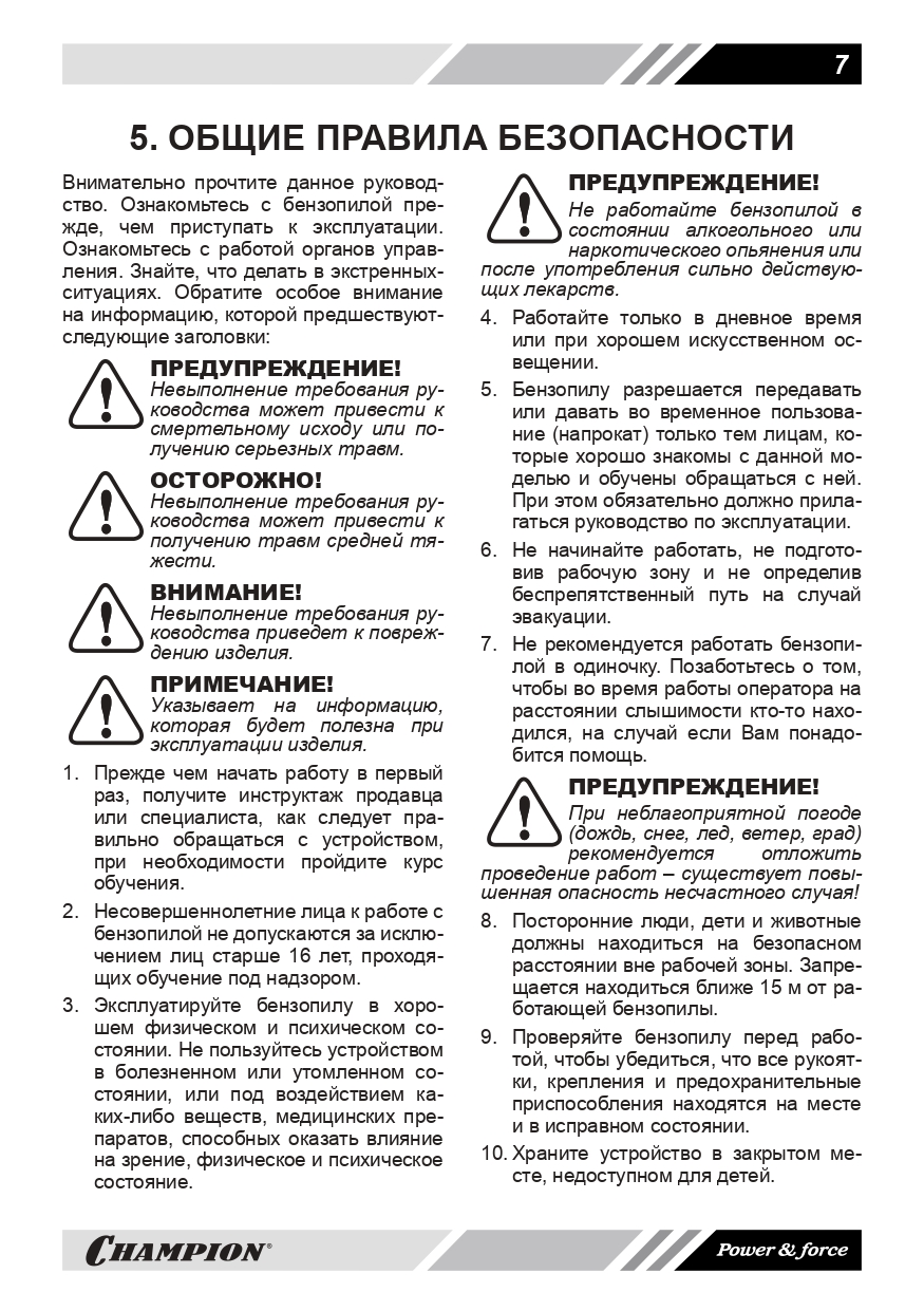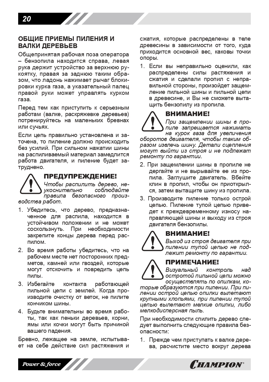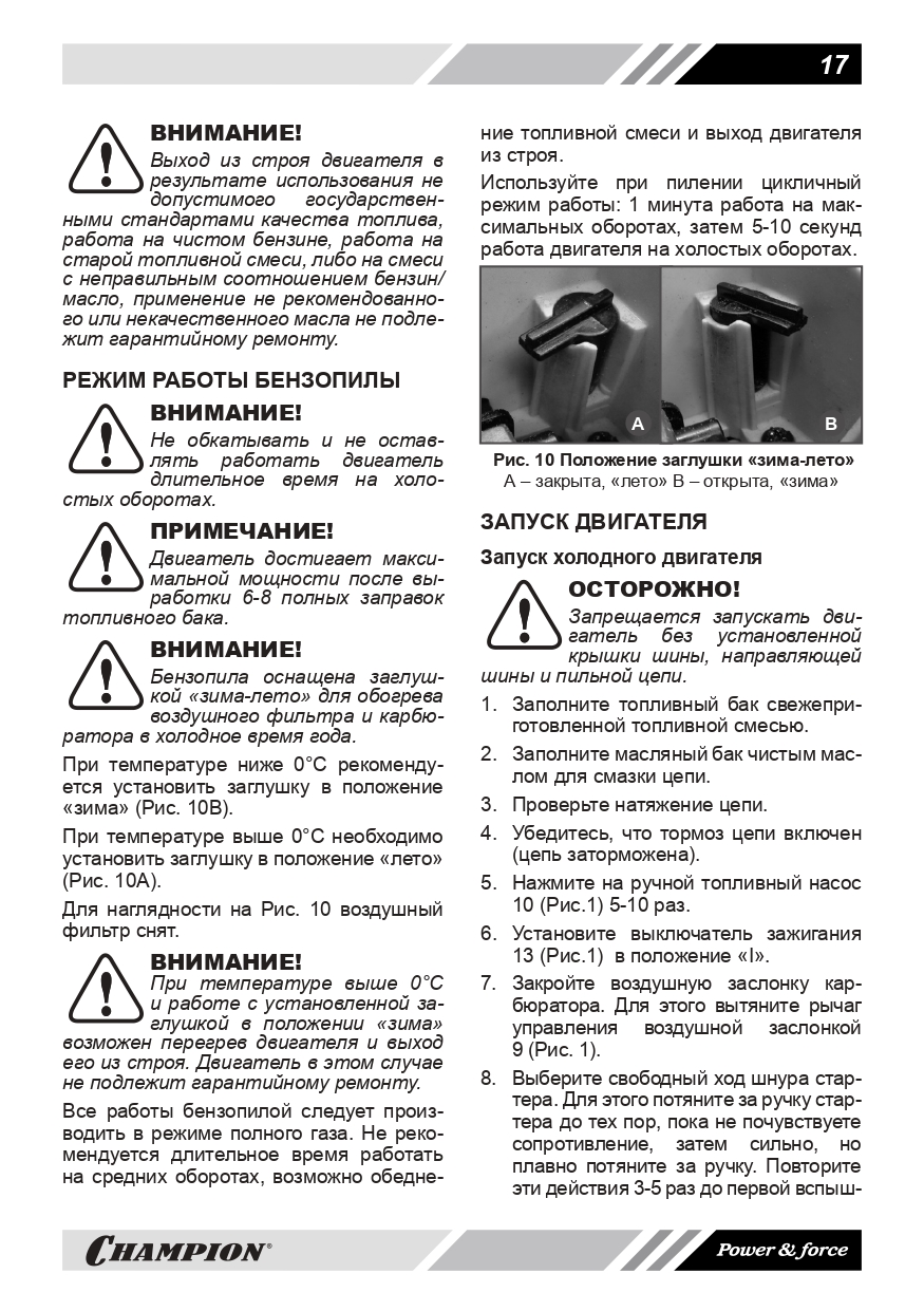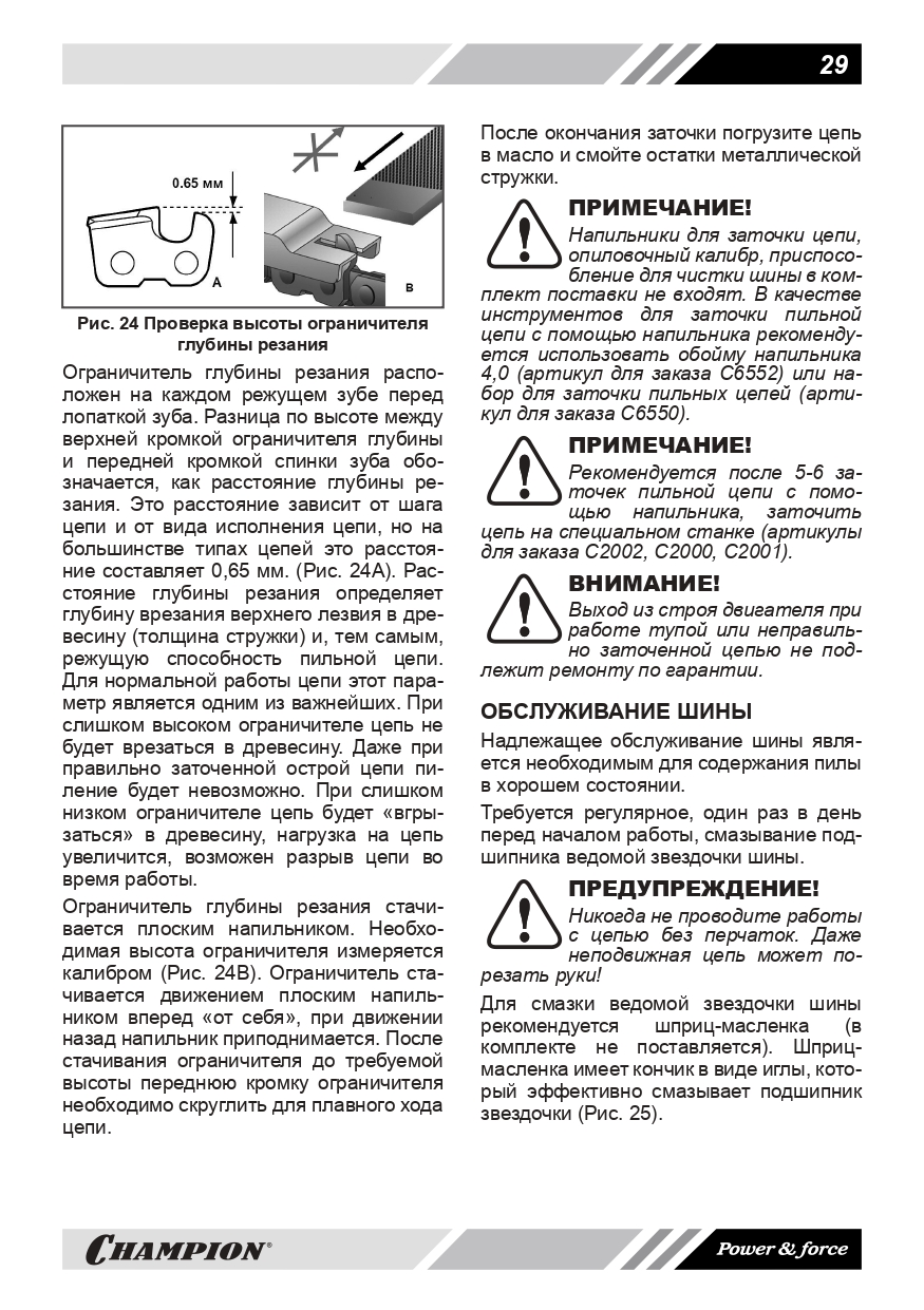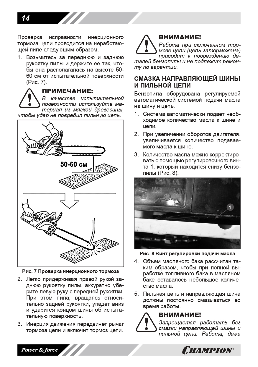 Бензопила Champion-237 предназначена для распила древесины.Относится к разряду пил, предназначенных для бытового применения. Двигатель 2-х тактный с воздушным охлаждением. Заправляется бензином АИ-92+ маслом для двухтактного двигателя.Рекомендуется смазывать цепь и шину маслом для снижения трения между ними, что увеличит срок службы пильной гарнитуры.