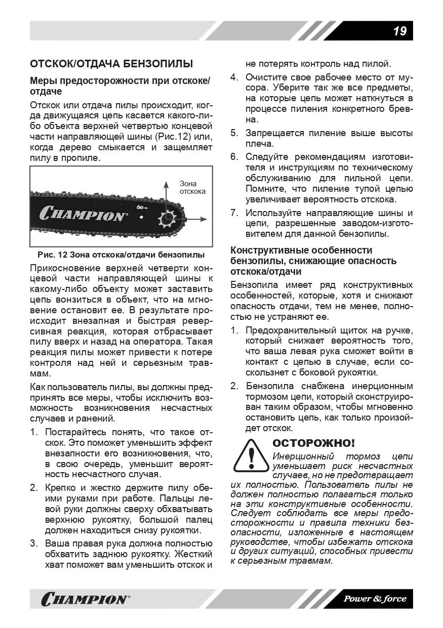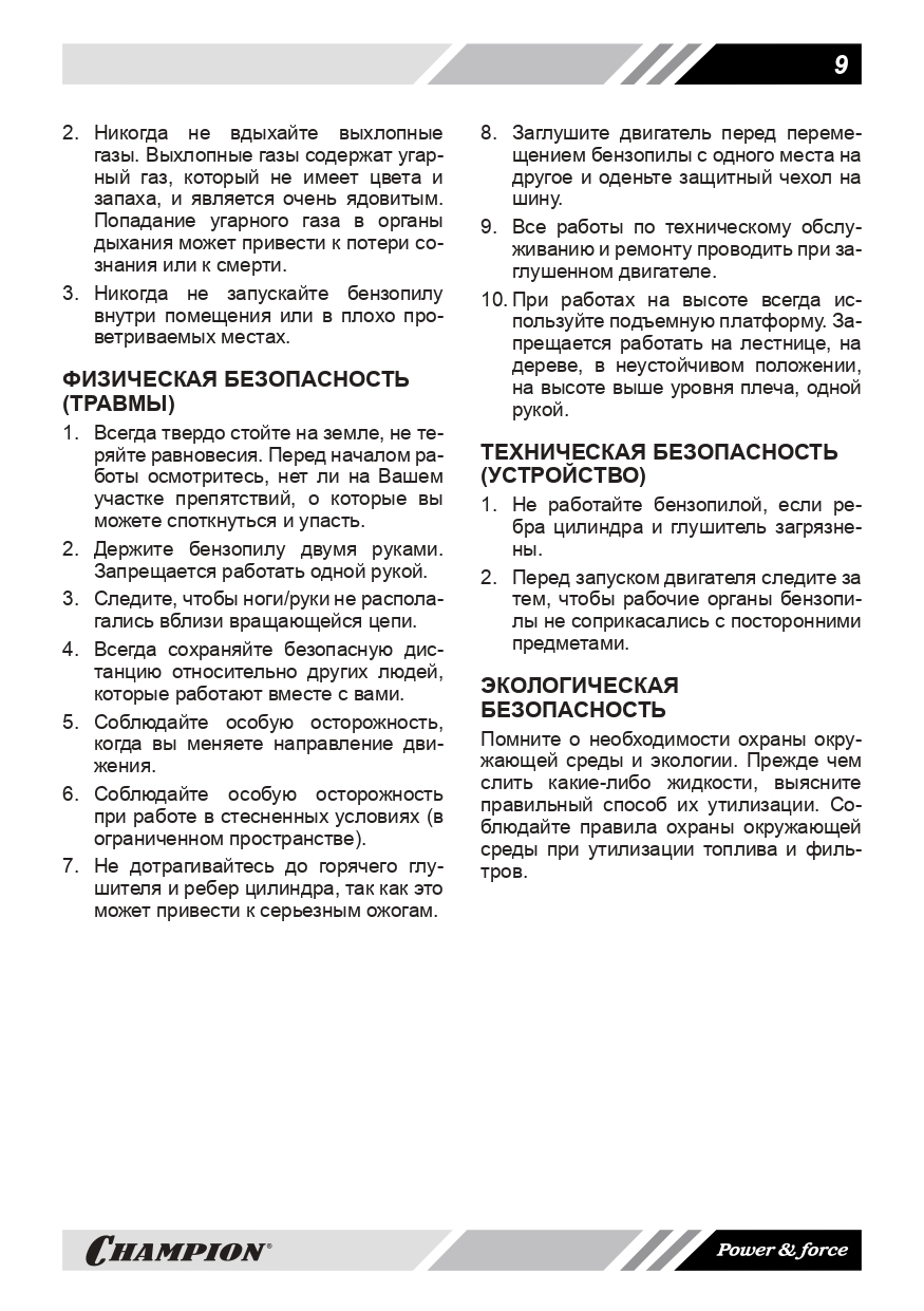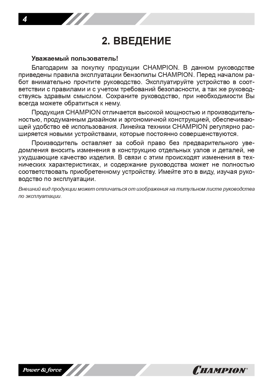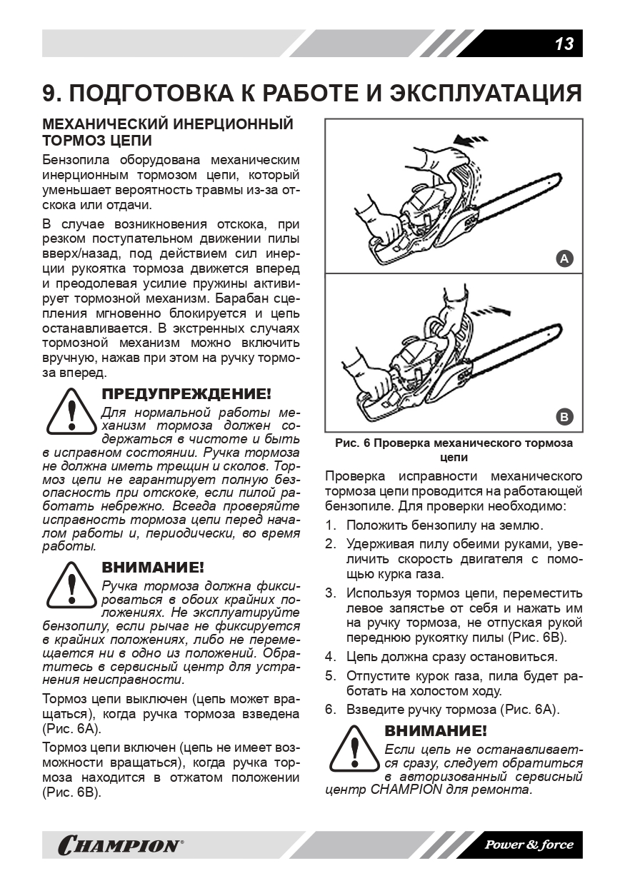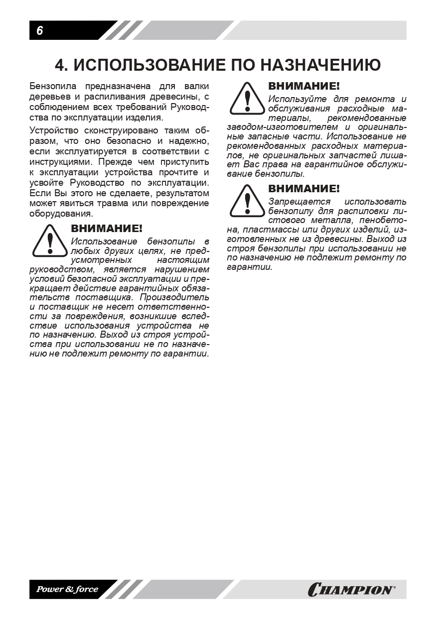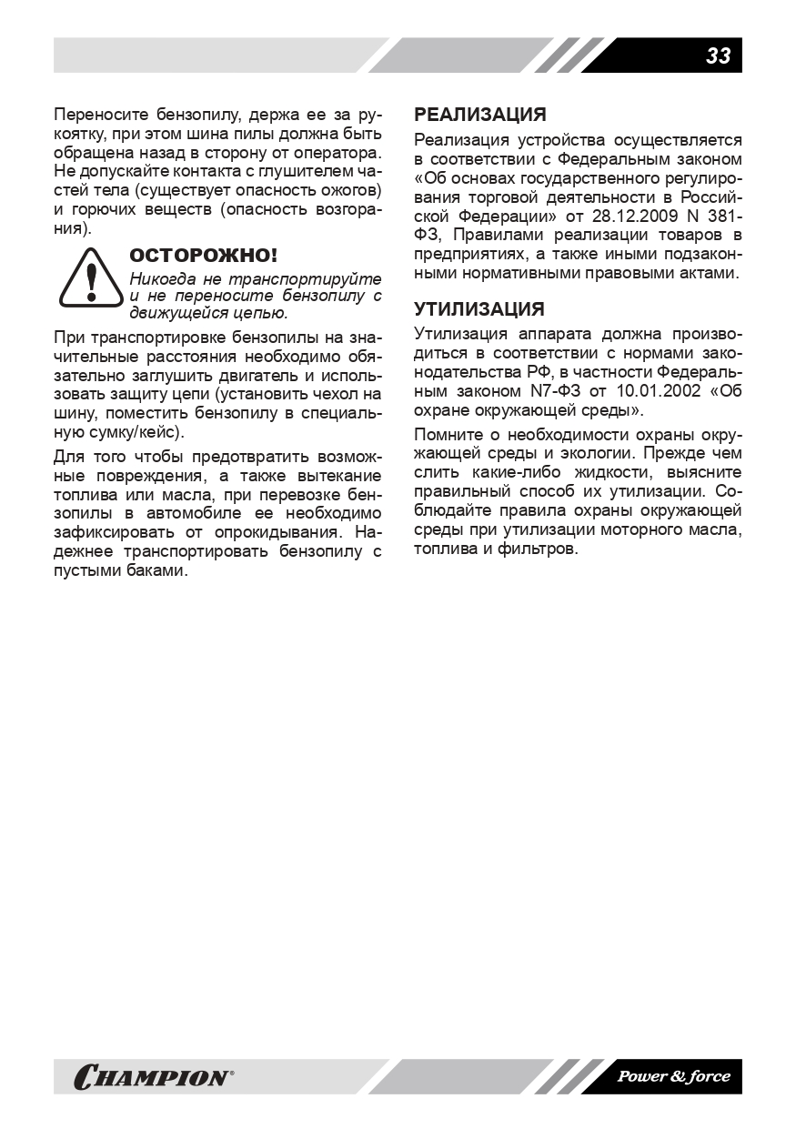 Бензопила Champion-237 предназначена для распила древесины.Относится к разряду пил, предназначенных для бытового применения. Двигатель 2-х тактный с воздушным охлаждением. Заправляется бензином АИ-92+ маслом для двухтактного двигателя.Рекомендуется смазывать цепь и шину маслом для снижения трения между ними, что увеличит срок службы пильной гарнитуры.