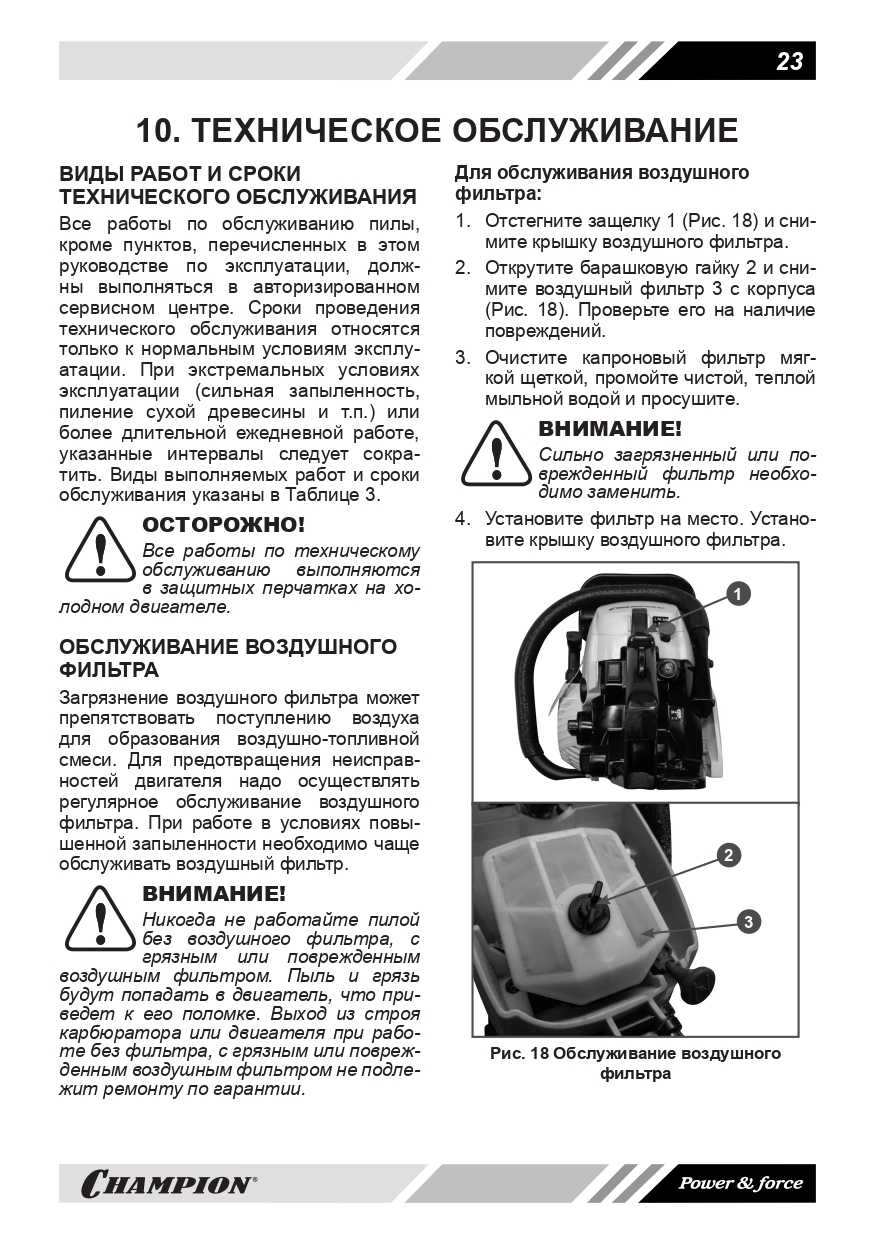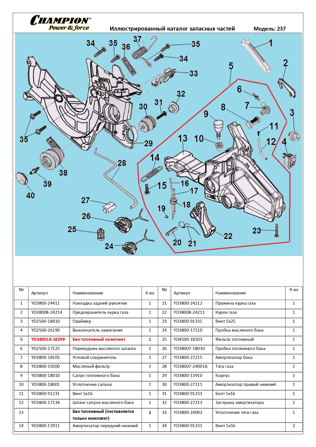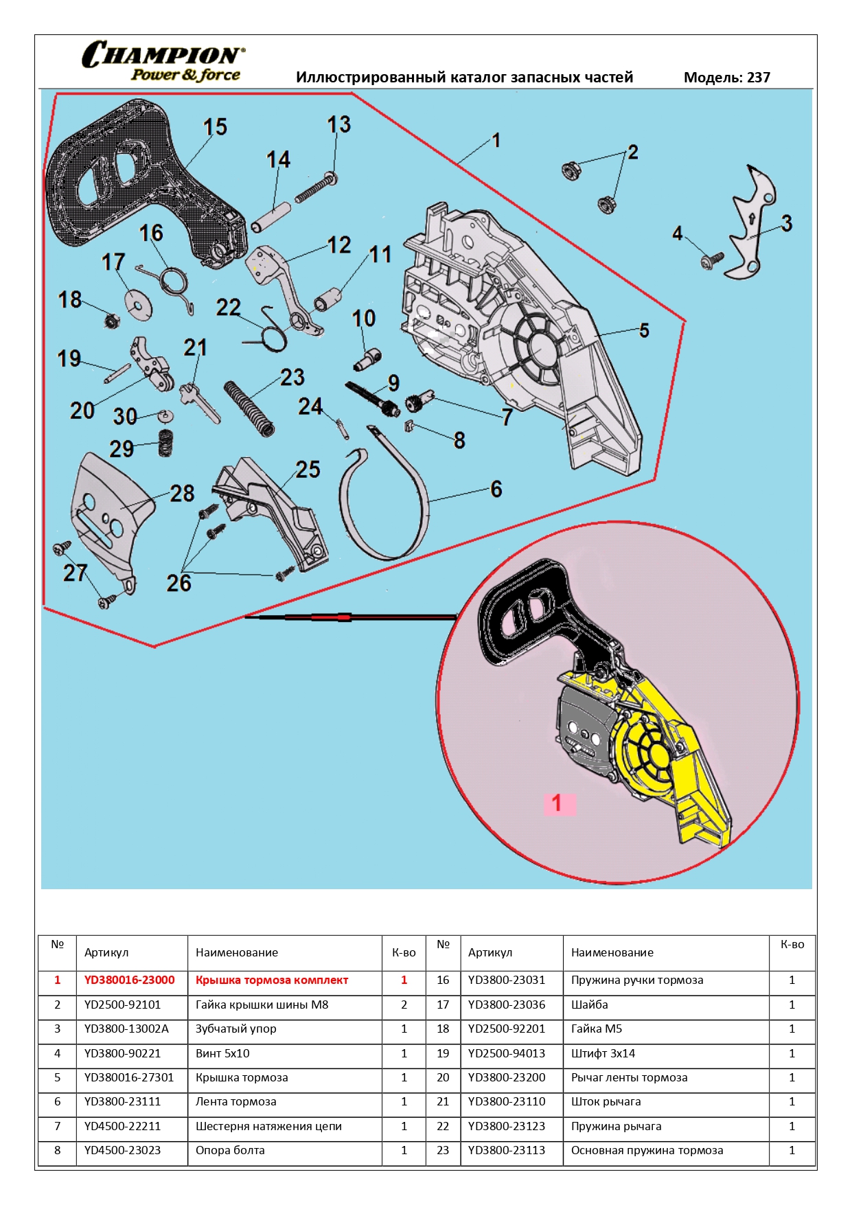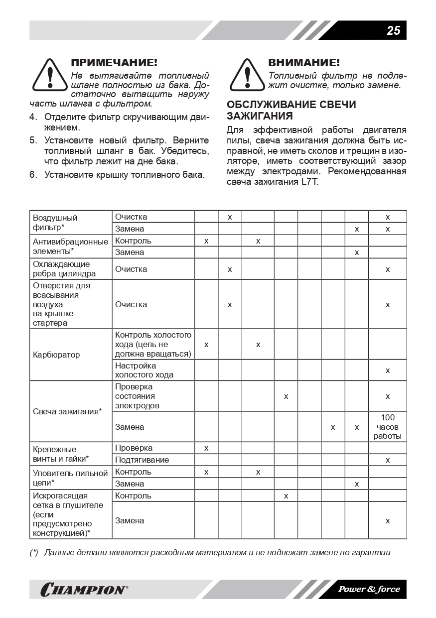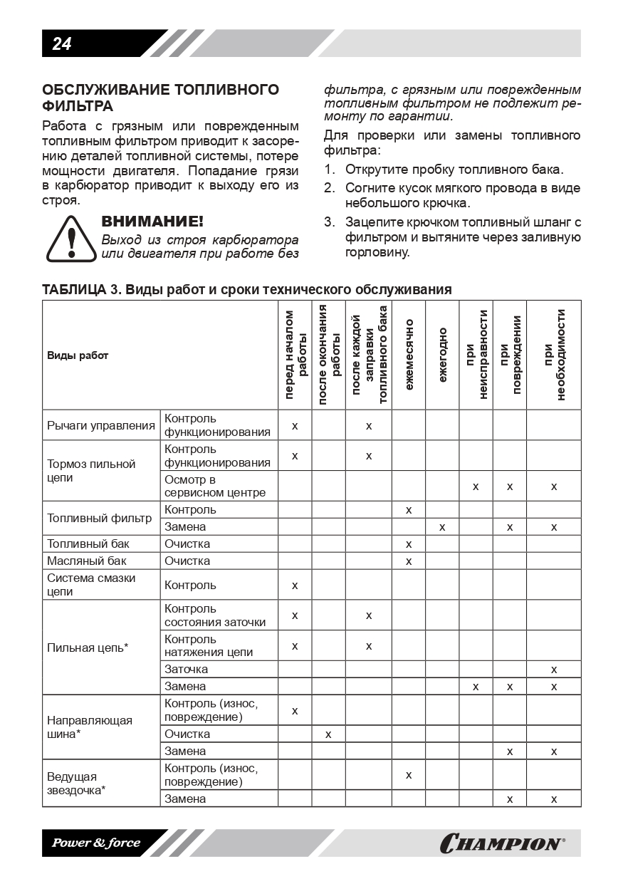 Бензопила Champion-237 предназначена для распила древесины.Относится к разряду пил, предназначенных для бытового применения. Двигатель 2-х тактный с воздушным охлаждением. Заправляется бензином АИ-92+ маслом для двухтактного двигателя.Рекомендуется смазывать цепь и шину маслом для снижения трения между ними, что увеличит срок службы пильной гарнитуры.