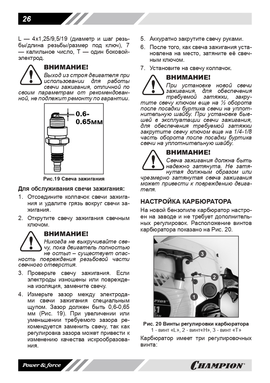Комплектация: Руководство по эксплуатации – 1 шт., Бензопила – 1 шт., Емкость для приготовления топливной смеси – 1 шт., Чехол для шины – 1 шт., Шина – 1 шт., Цепь пильная – 1 шт., Упор зубчатый – 1 шт., Винт крепления упора зубчатого – 1 шт., Отвертка – 1 шт., Ключ свечной – 1 шт., Напильник – 1 шт.