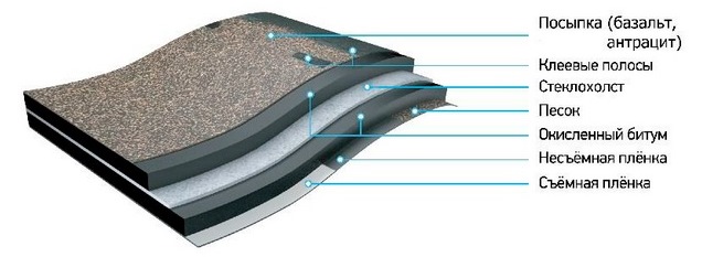Верхняя поверхность черепицы покрыта базальтом и антрацитом, а нижняя посыпкой из мелкозернистого песка.