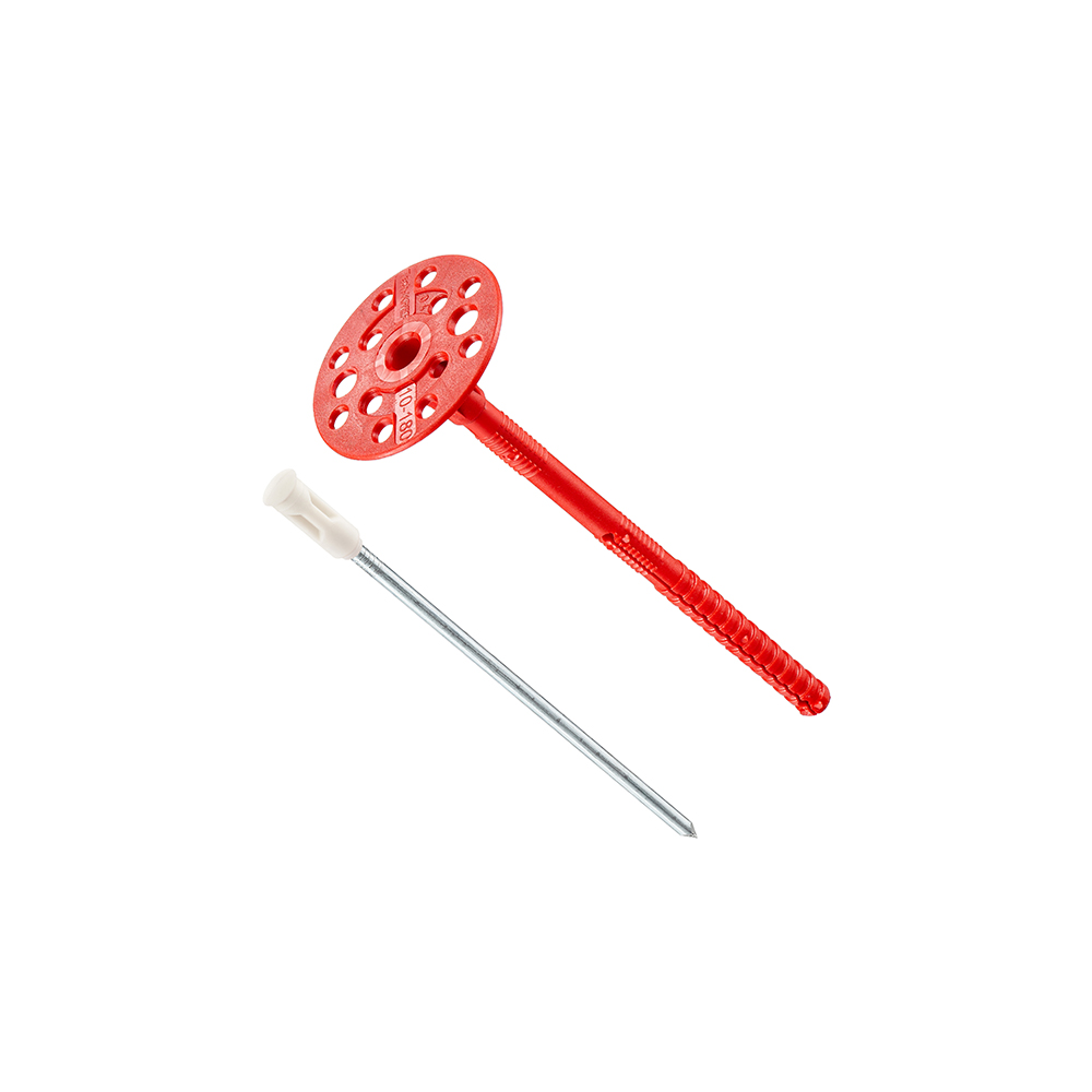 Дюбель для теплоизоляции 10х180мм с металлическим гвоздем с термоголовкой применяется для крепления теплоизоляционных материалов максимальной толщиной 130мм к фасадам зданий.