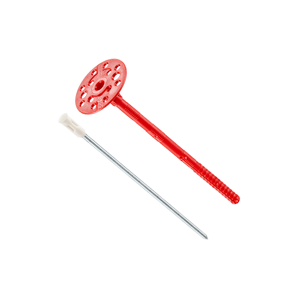 - Металлический оцинкованный гвоздь с термоголовкой, вбивается в распорный элемент, чтобы обеспечить плотную фиксацию. Пластиковый колпачок защищает от коррозии и предотвращает потерю тепла.