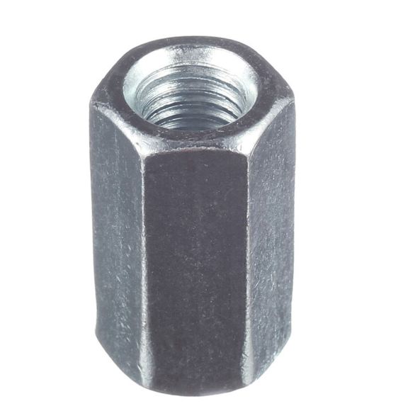 Гайка соединительная оцинкованная DIN6334 – специальный крепеж для надежного соединения двух резьбовых стержней или удлинения резьбовых соединений там, где требуется максимальная прочность и площадь контакта резьбы.