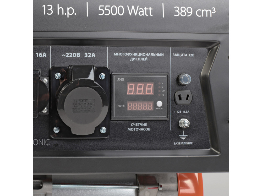 4. Информативный цифровой мультидисплей: Предоставляет исчерпывающую информацию о работе генератора, включая уровень масла и топлива, мощность, напряжение, ток и частоту.
