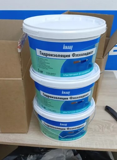 КНАУФ-Флэхендихт представляет собой водную дисперсию синтетического латекса и инертных заполнителей, голубого цвета. Используется для гидроизоляции поверхностей стен и пола внутри зданий. Не содержит растворителей.