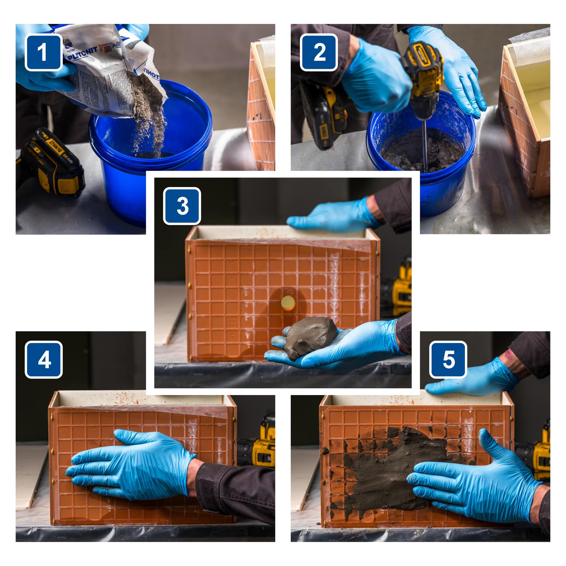 Для затворения сухой смеси использовать воду из питьевого водоснабжения. При проведении работ методом послойного нанесения применяется сухая смесь, наносимая тонкими слоями на влажную поверхность. При производстве работ методом заполнения, применяется пластичная растворная смесь, полученная путем смешивания сухой смеси с заранее отмеренным количеством воды (0,17-0,19 л на 1 кг сухой смеси) до получения однородной консистенции. Сроки схватывания растворной смеси – начало не ранее 1,5 минут, конец не позднее 10 минут с момента затворения.