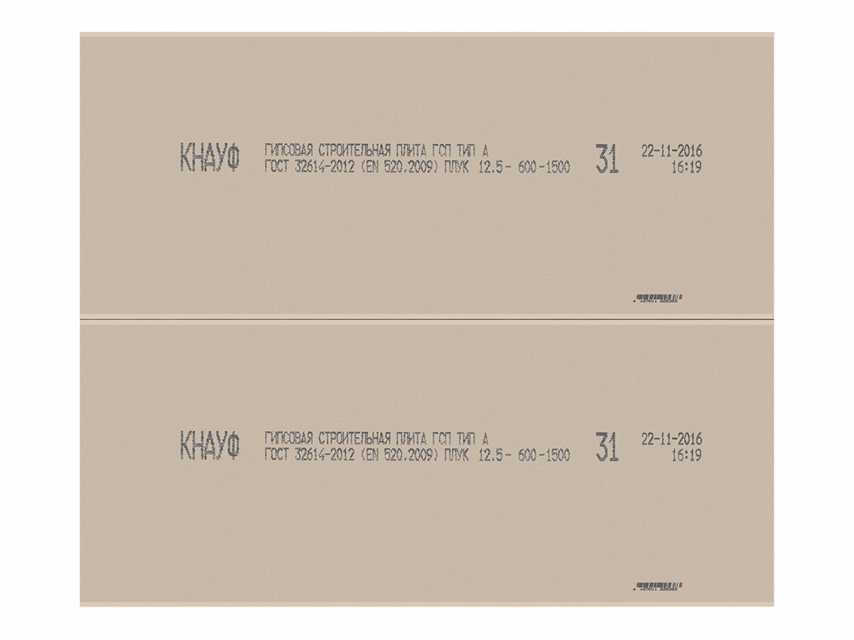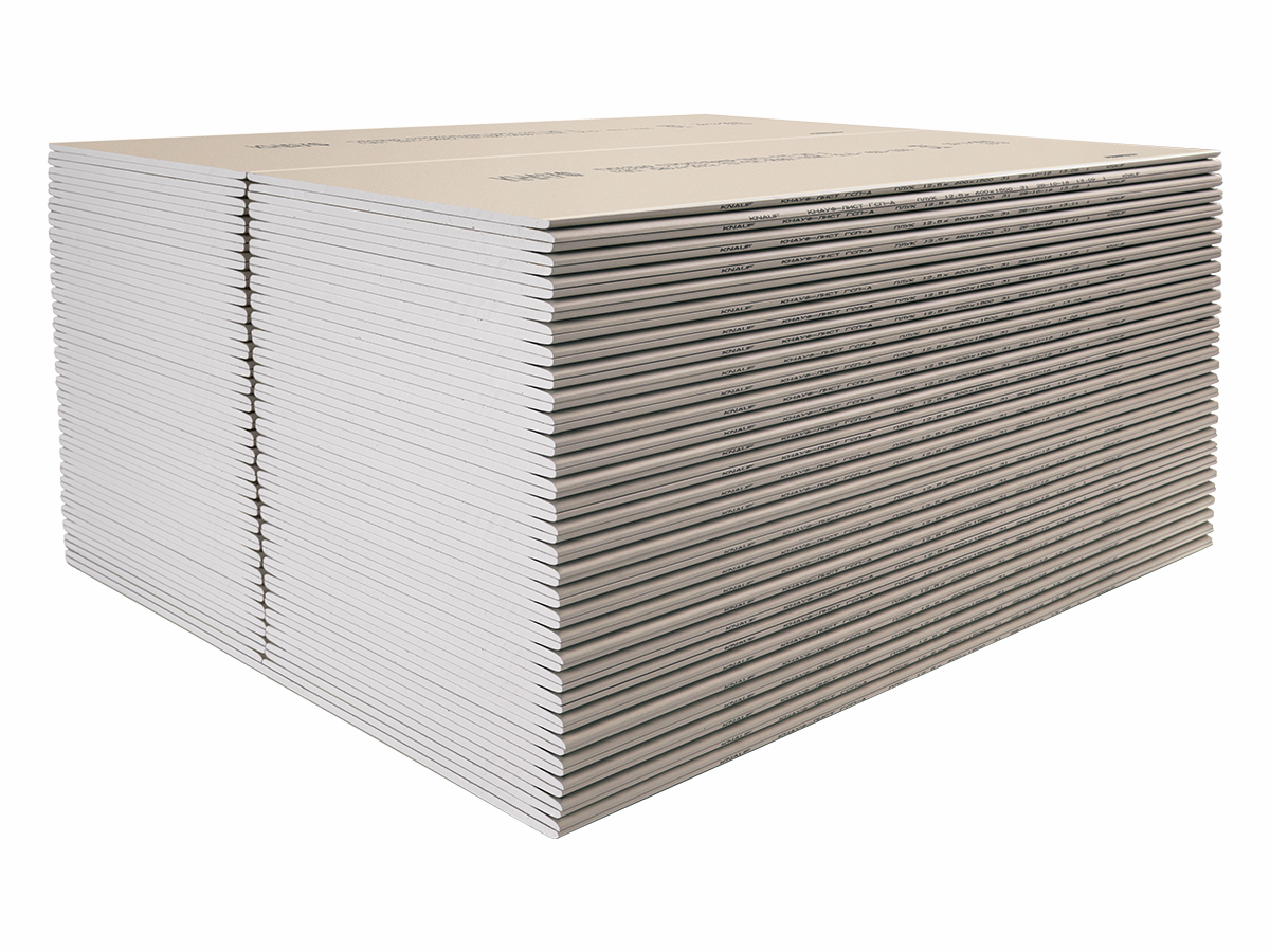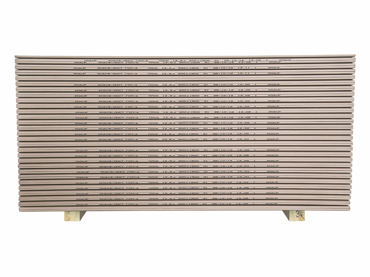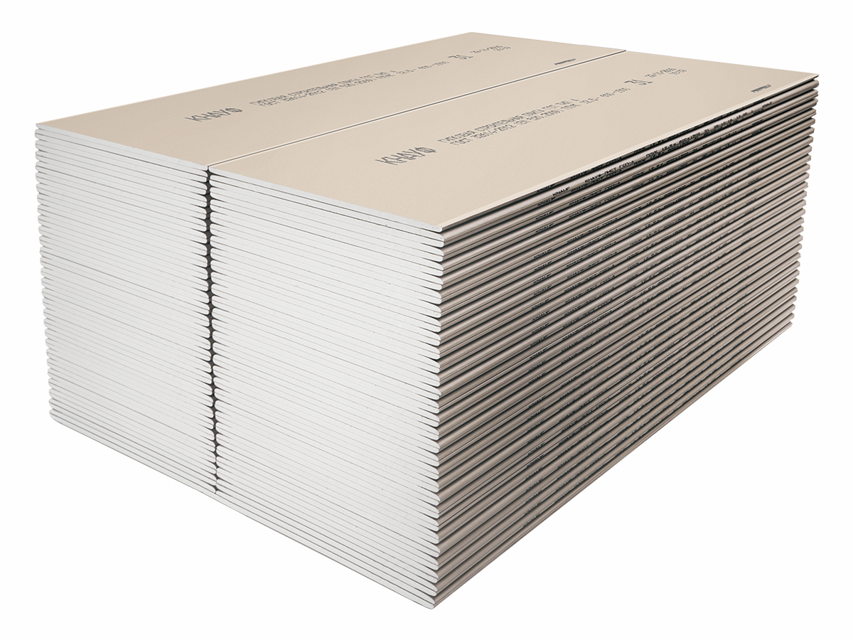 Гипсокартон стандартный КНАУФ малоформатный с кромкой ПЛУК - гипсокартонный КНАУФ-лист (ГКЛ) представляет собой прямоугольный элемент, который состоит из двух слоев специального картона с прослойкой из гипсового теста с армирующими добавками, при этом боковые кромки полосы зафальцовываются краями картона (лицевого слоя). Для формирования сердечника применяется гипсовое вяжущее марки Г4 по ГОСТ 125-79.