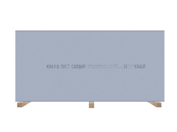 Гипсокартон Сапфир КНАУФ – универсальный отделочный материал для облицовки стен, устройства перегородок и подвесных потолков, в помещениях, к отделке которых предъявляются требования по высокому качеству поверхности, ударостойкости, влагоогнестойкости и звукоизоляции.