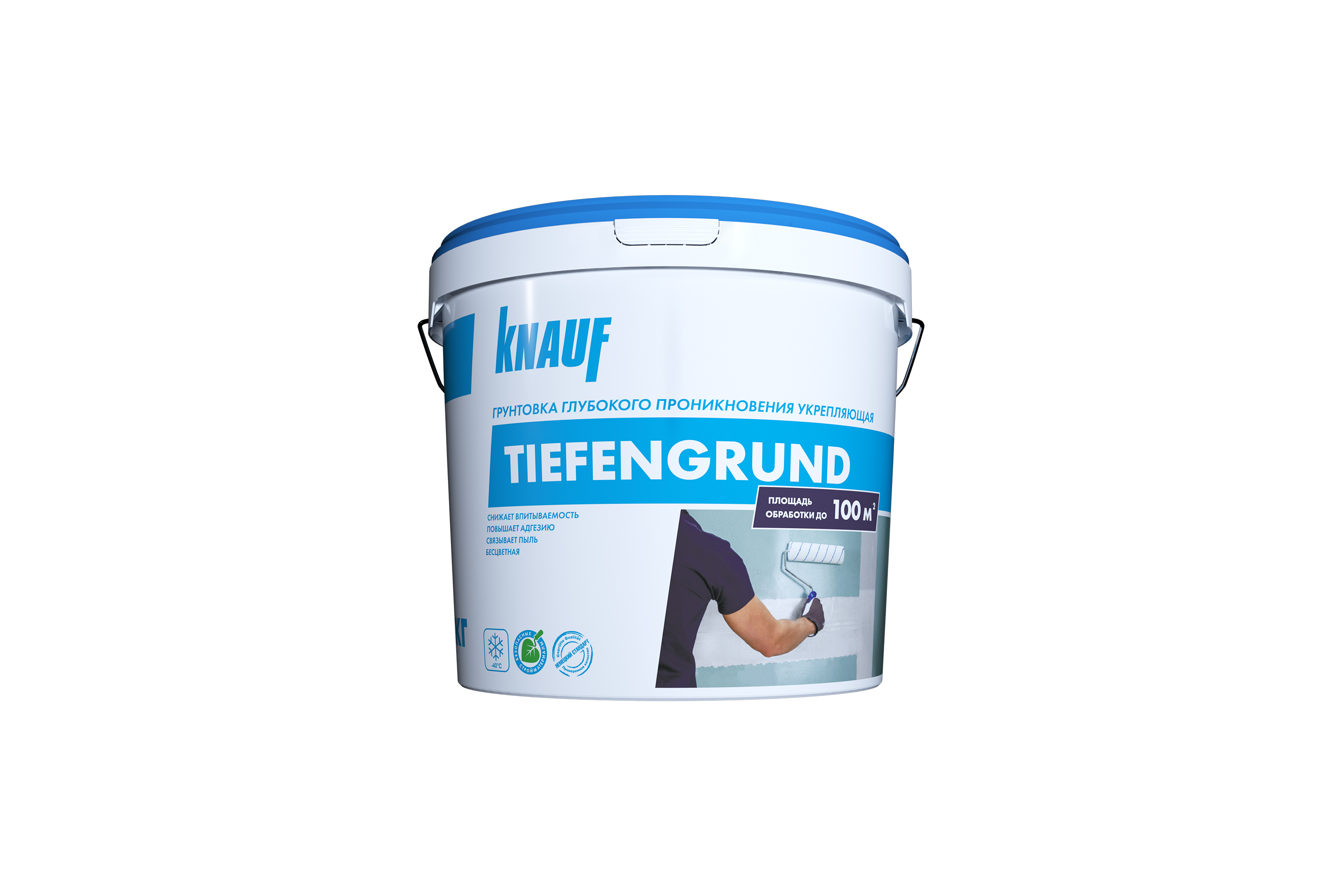 Грунтовка КНАУФ-Тифенгрунд универсальная глубокого проникновения F - быстросохнущая, не содержащая растворителей, готовая к употреблению грунтовка для предварительной обработки основания в целях улучшения адгезии (сцепления покрытия с основанием) и укрепления поверхности при укладке керамической плитки, окраске, приклеивании обоев и шпаклевании.