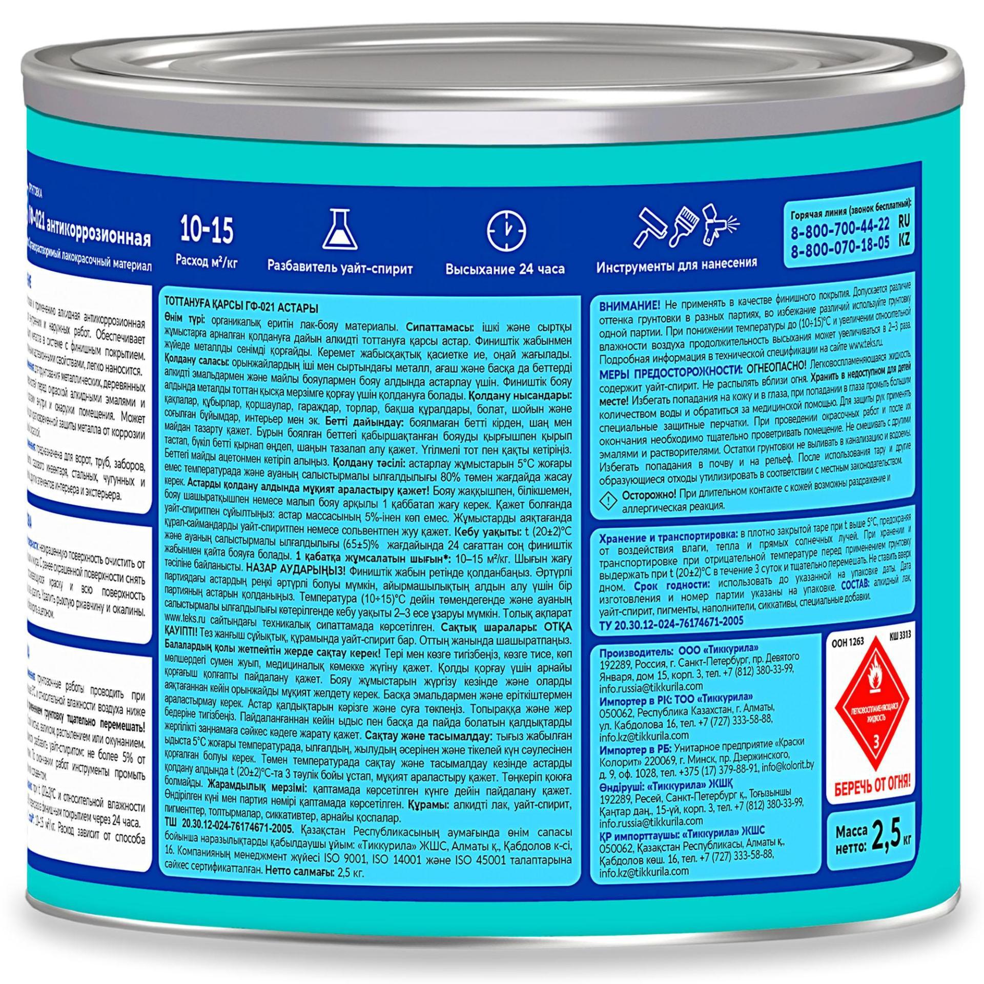 Хранение и транспортировка: Транспортировать и переносить в плотно закрытой таре. Хранить в плотно закрытой таре, предохраняя от воздействия влаги и прямых солнечных лучей, вдали от источников отопления. При хранении грунтовки при отрицательной температуре перед применением грунтовку выдержать до комнатной температуры и тщательно перемешать. Срок годности: 1 год
