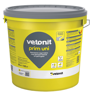 Vetonit prim uni – высококачественная фасадная тонирующая грунтовка под декоративную штукатурку для подготовки поверхности перед нанесением декоративных штукатурок на акриловой, силикатно-силиконовой, силиконовой основе.