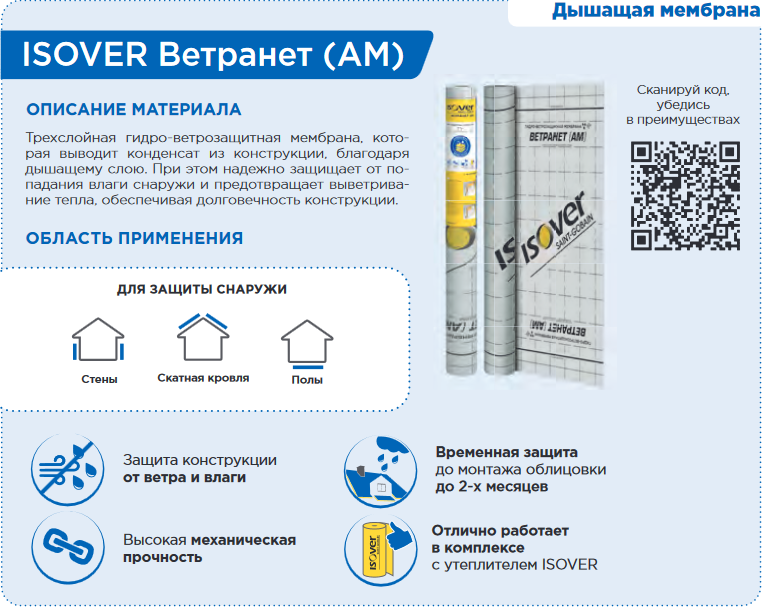 - дышащая мембрана: выводит конденсат изнутри конструкции, защищает конструкцию от попадания влаги снаружи и от выветривания тепла