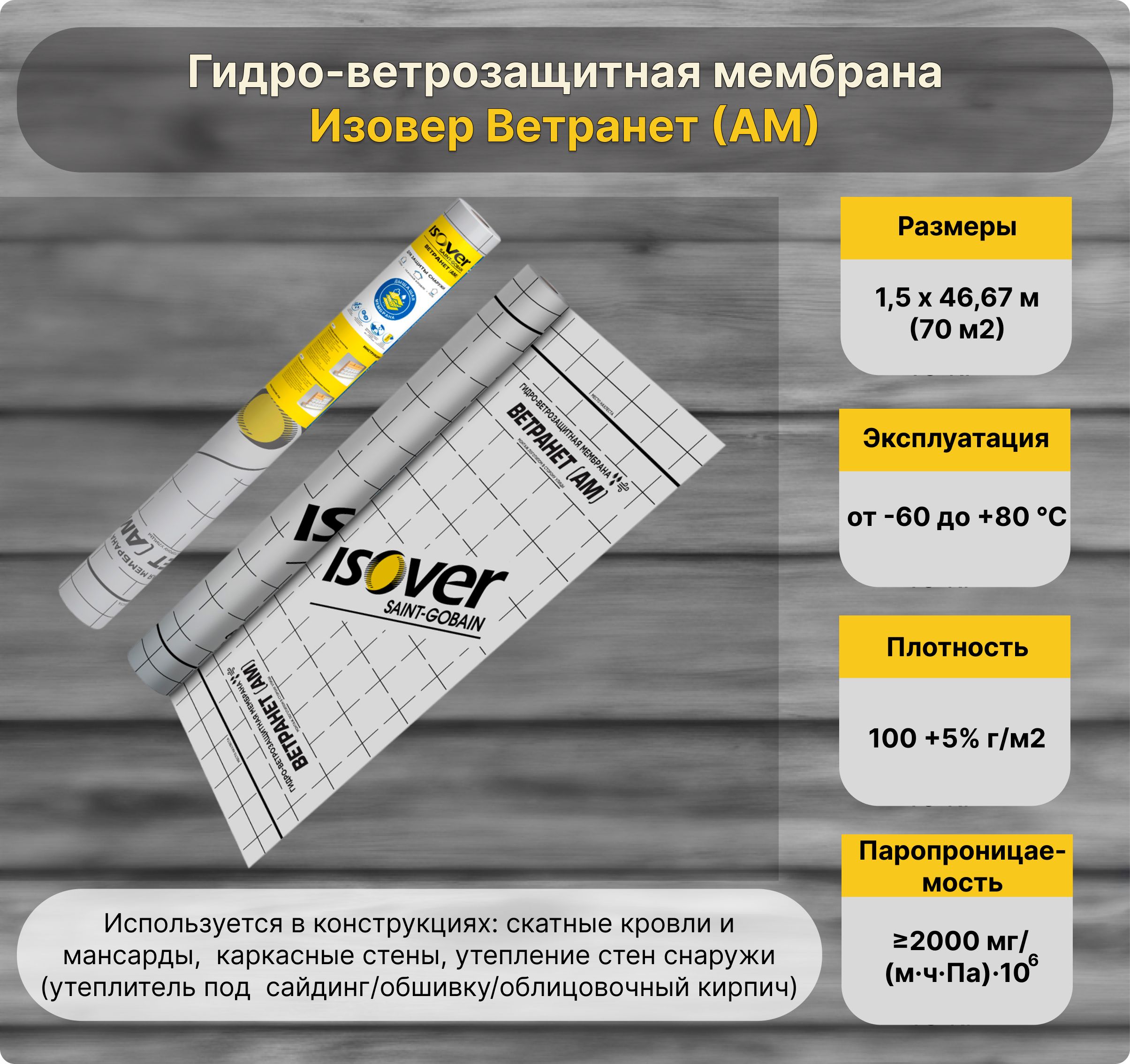 Ветонит (Изовер) Ветранет AM гидро-ветрозащита трехслойная 1,5 х 46,67 м / 70 кв.м/рул