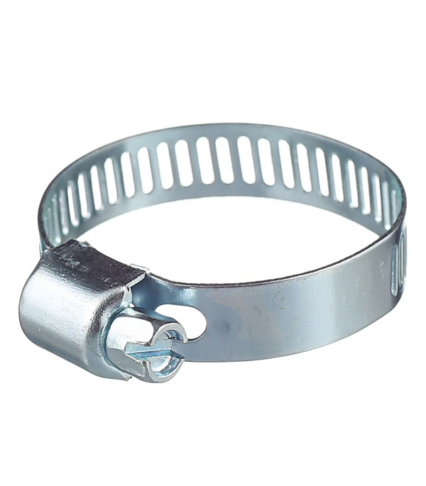 Стяжной хомут червячного типа состоит из стальной ленты и замка, который можно повернуть крестовой или прямой отверткой, а также гаечным ключем. Стяжное усилие передается червячным механизмом. Нагрузка равномерно распределяется по всей окружности прилегания шланга к трубе, что обеспечивает плотное прилегание и герметичность соединения.