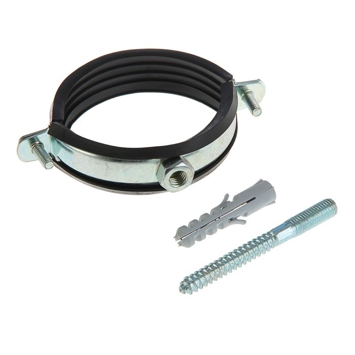 Состав: хомут с шурупом, уплотнитель – резина, дюбель.