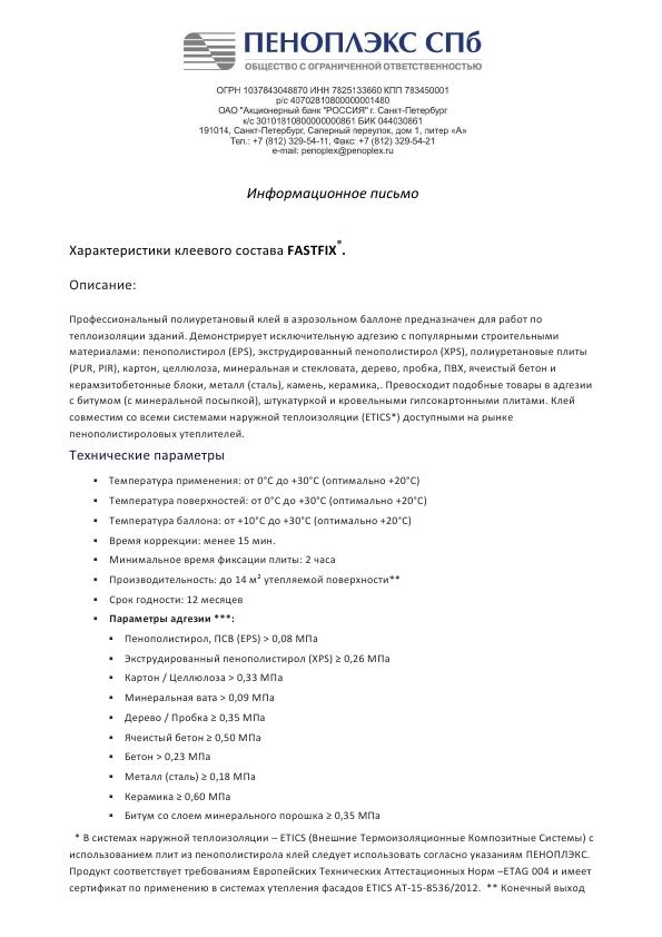 Полиуретановый клей ПЕНОПЛЭКС® FASTFIX® является высокоэффективным средством для крепления теплоизоляции из экструдированного и вспененного пенополистирола к различным основаниям: бетон, газобетон, кирпич, керамические блоки и др.