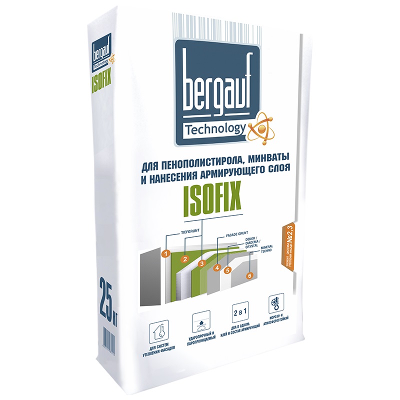 Клей для пенополистирола Bergauf Isofix 25 кг - походит для тепло и звуко изоляционных плит и минеральной ваты, используется на объектах с нормальной и повышенной влажностью, так же устойчив к воздействию температур.