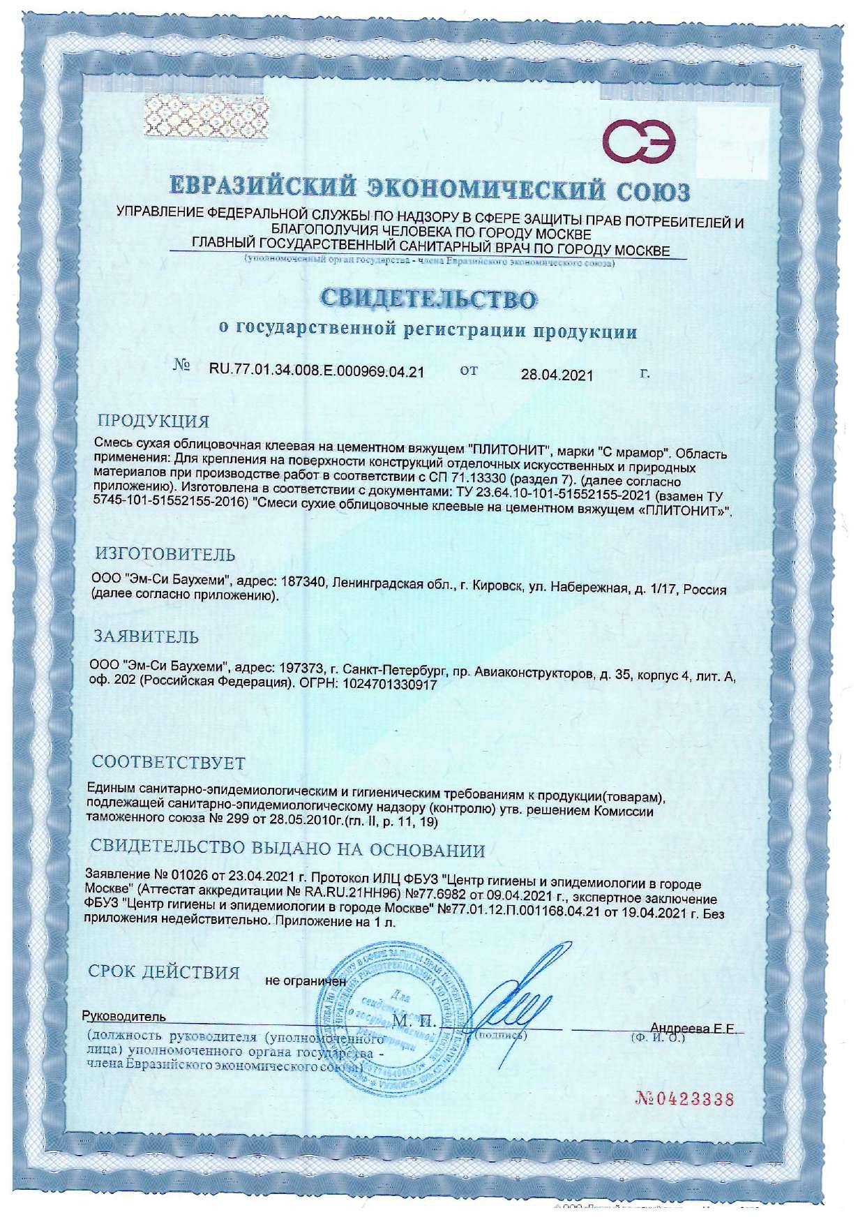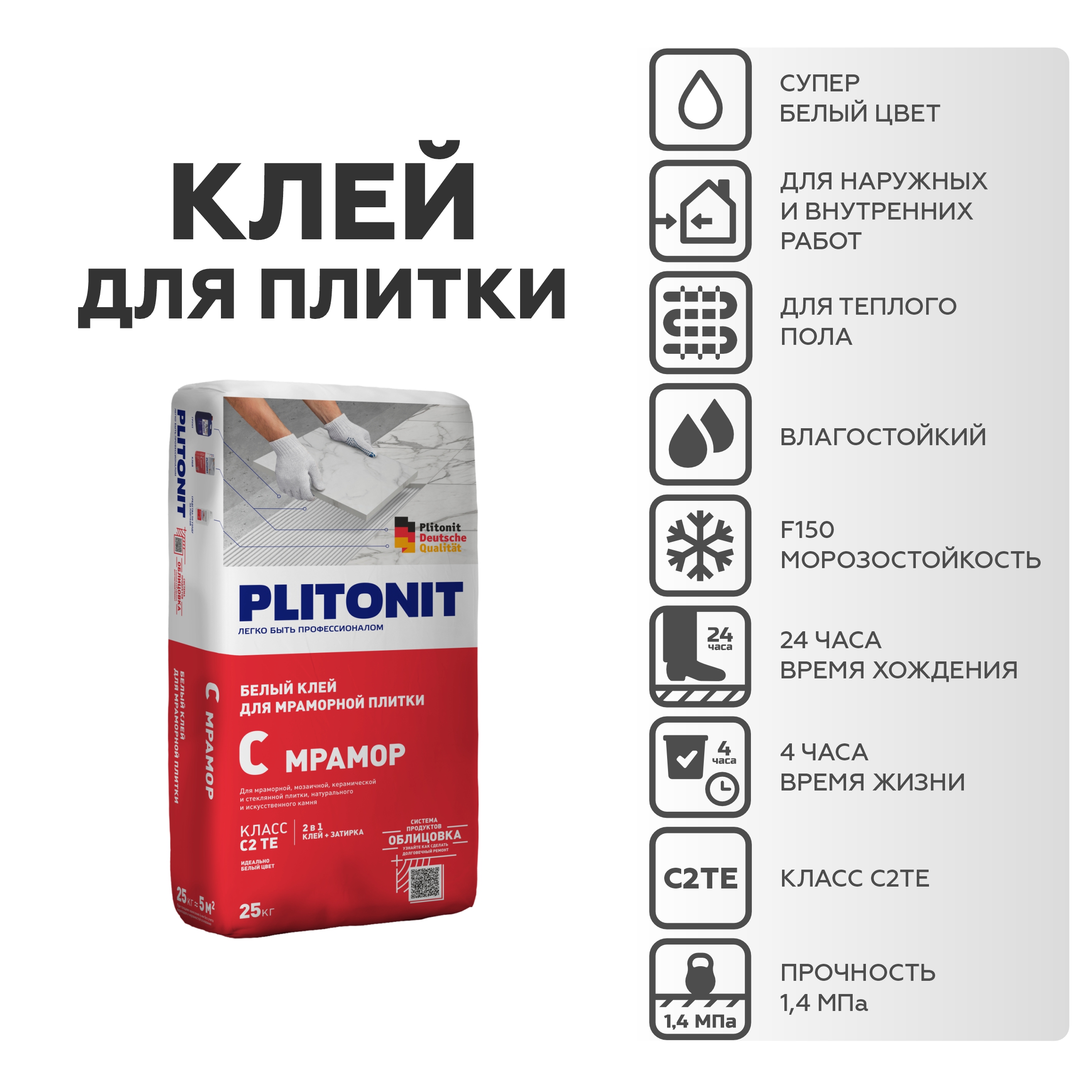 Клей для плитки Плитонит С Мрамор 25 кг - белый клей, предназначенный для приклеивания мозаичной и стеклянной плитки, плитки из искусственного и натурального камня, облицовочной плитки из любых разновидностей мрамора, керамической плитки.