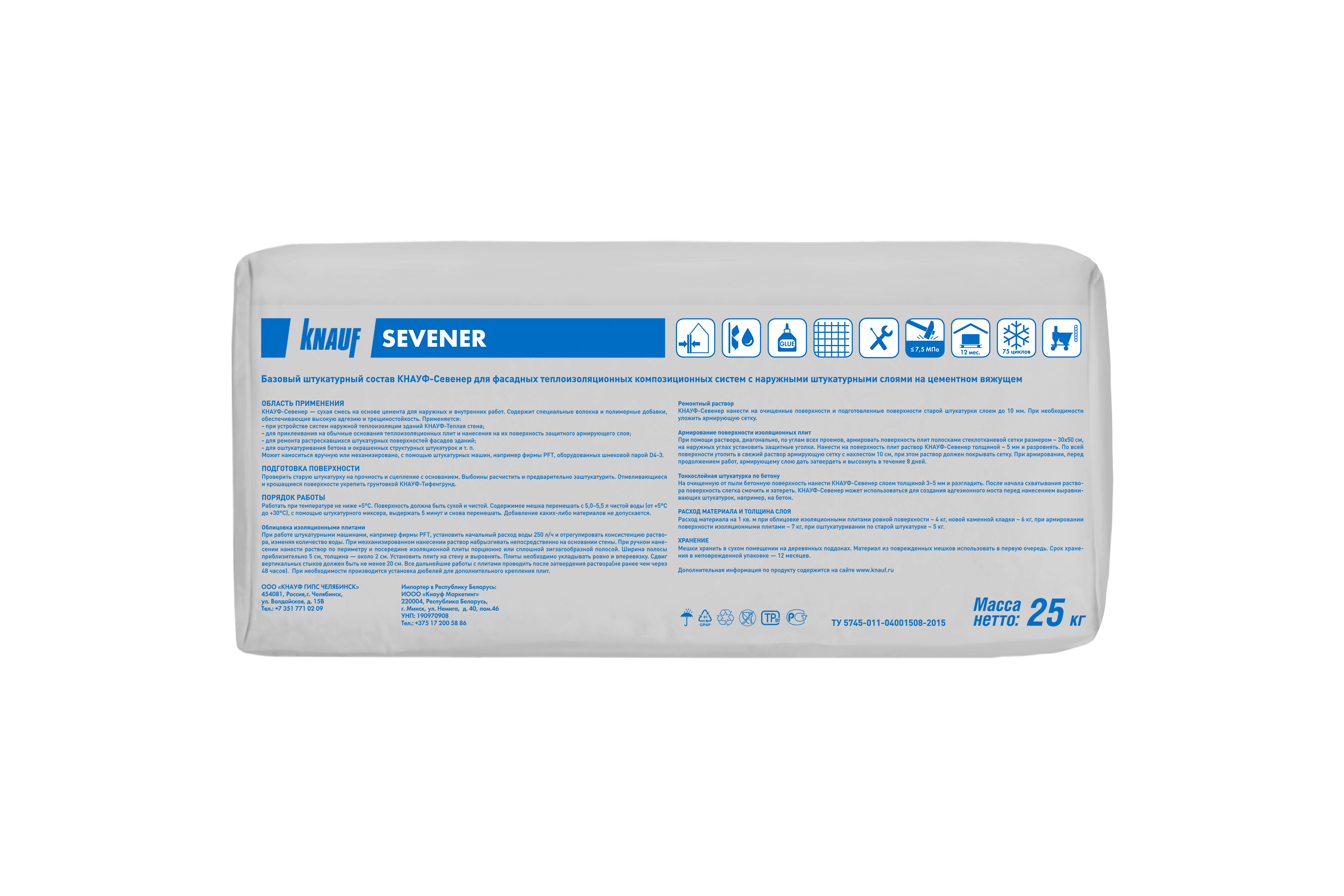 - как тонкослойный промежуточный слой штукатурки для гладких бетонных поверхностей. КНАУФ-Севенер можно наносить на структурированные, прочные, очищенные от пыли минеральные штукатурки и такие же поверхности с дисперсионным покрытием или штукатурные покрытия на основе искусственных смол (при необходимости, после соответствующей обработки).