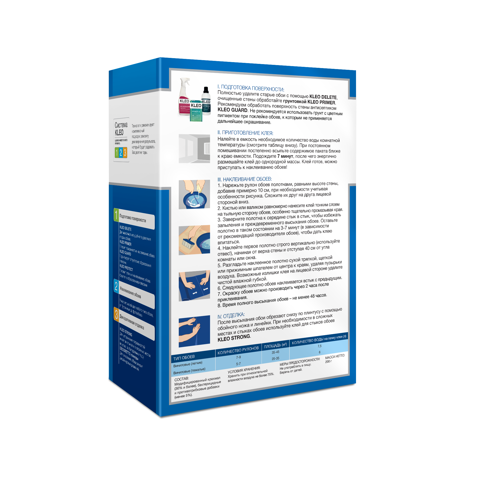 KLEO SMART 7-9 - для наклеивания всех видов бумажных и виниловых обоев. Наносится на обои. При нанесении обои легко корректируются. Сохраняет прозрачность после нанесения. В готовом виде хранится 10 дней. Для внутренних работ.
