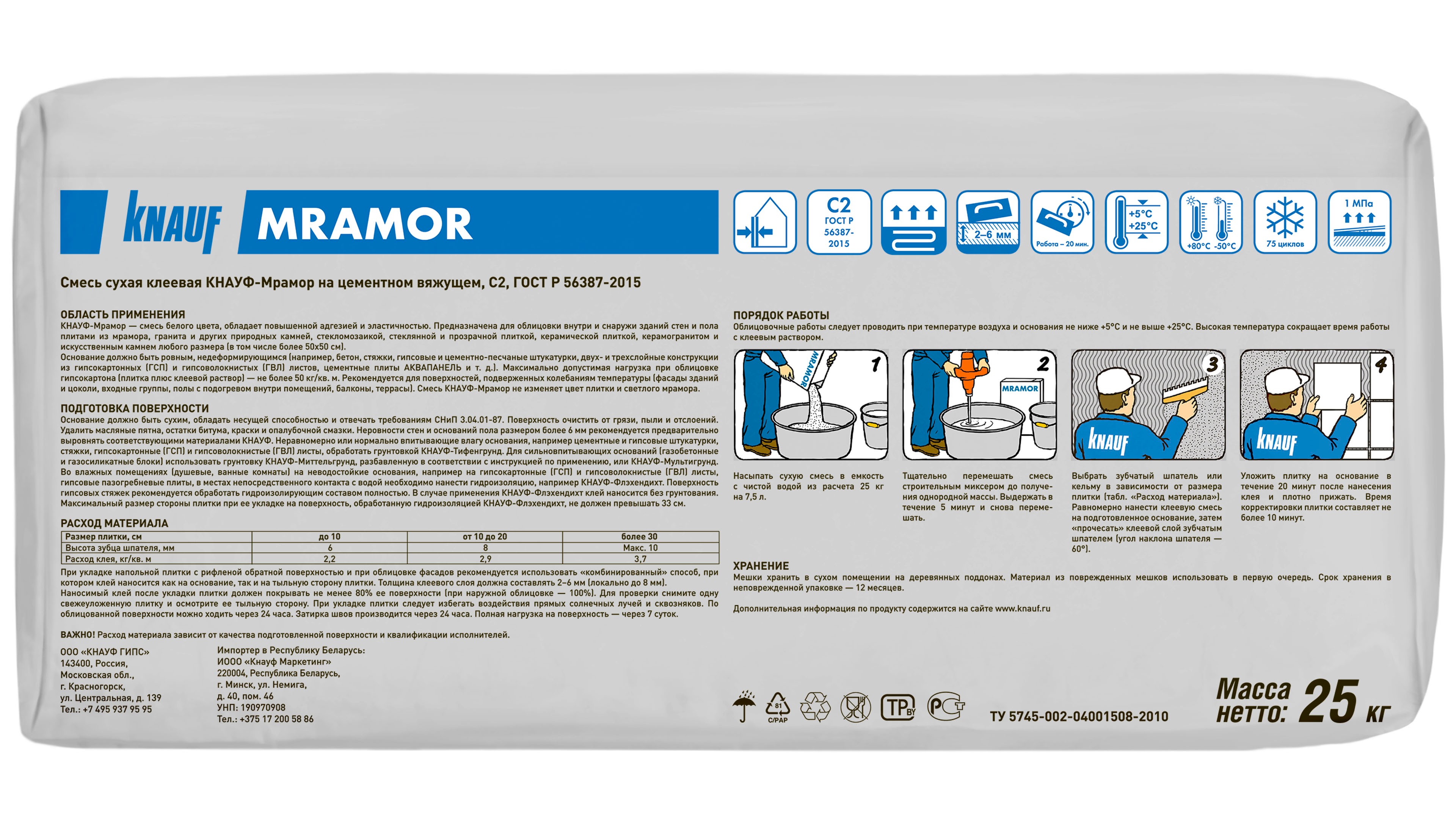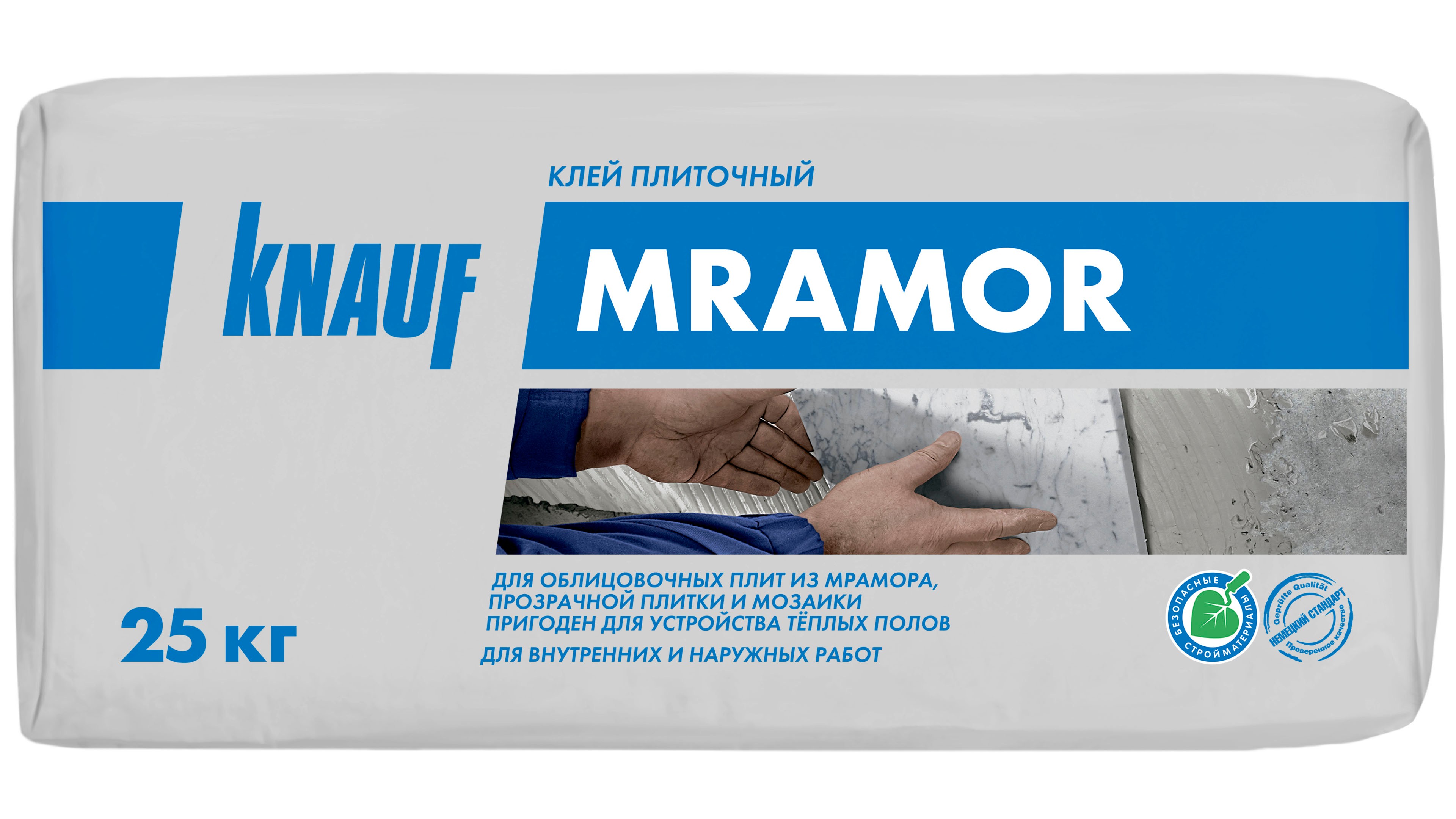 - Клей плиточный «Мрамор» КНАУФ-Мрамор быстро схватывается, можно ходить, а также заделывать швы через 6 часов.