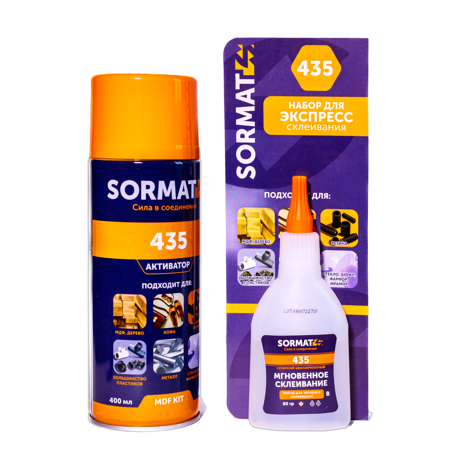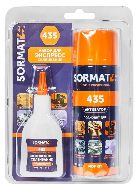 Двухкомпонентный цианакрилатный клей SORMAT 435 – представляет собой комплект, состоящий из цианакрилатного клея (80 гр) и активатора в аэрозольной форме (400 мл). Используется для экспресса склеивания широкого спектра материалов: кожи, бумаги, дерева, МДФ, пластика, резины и металла. Может применятся в различных сферах, таких как: мелкий ремонт мебели, подклеивание шпона, ПВХ пленки на межкомнатных дверях, кухонных фасадах, соединение стыков МДФ плинтуса и многое другое.