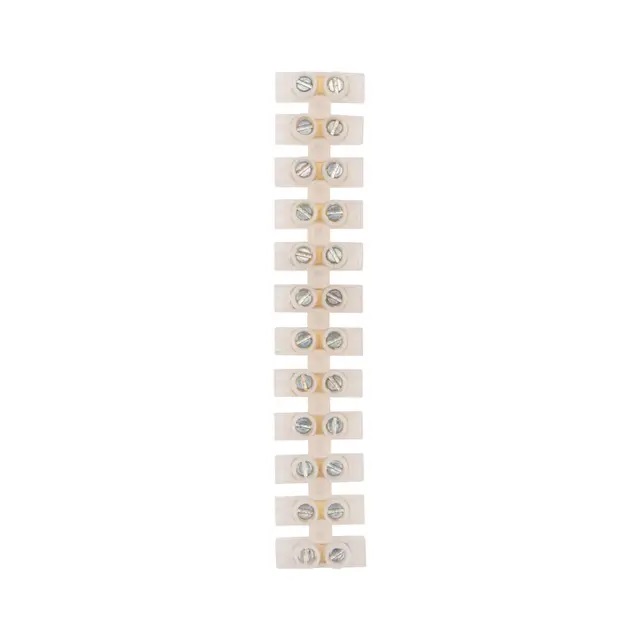 Клемная колодка состоит из 12 парных зажимов и легко режется на блоки с меньшим числом клеммных пар. Подключение электрических проводников осуществляется при помощи прижатия проводов винтами из оцинкованной стали. Материал корпуса колодки – белый или черный пластичный полиэтилен. Материал металлической планки – латунь.