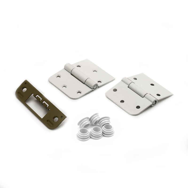 без порога, 2 стойки, 1 верхняя перекладина длиной 837мм, 2 универсальные петли, ответная планка замка и заглушки для крепёжных отверстий.