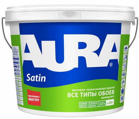 Аура Сатин - хорошая водная краска для обоев. Искал краску хорошего качества, недорогую, которую можно использовать для покраски стен в детской. После нанесения обои сохраняют свою текстуру и рисунок, что очень здорово. Полученным результатом очень доволен! Покупал в Материке, привезли быстро.