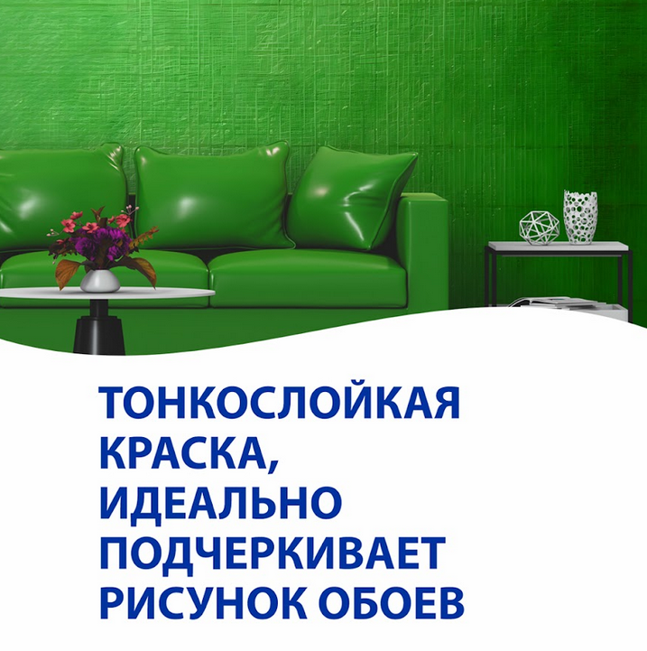 - Тонкослойная, идеально прокрашивает и подчеркивает рисунок обоев, позволяет перекрашивать поверхность обоев несколько раз.