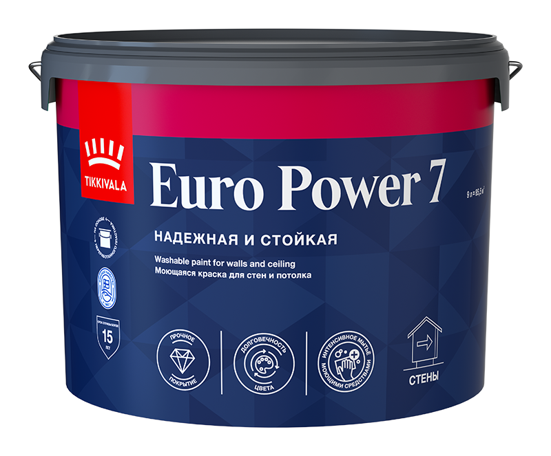 Водоразбавляемая латексная краска EURO POWER 7 для окраски стен и потолков в помещениях с нормальной и повышенной влажностью, относится к линейке Евро.
