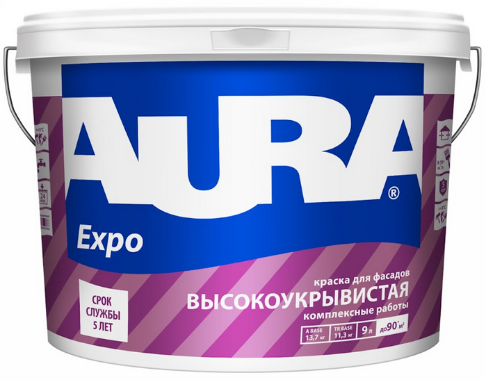 Краска Аура Expo – матовая водно-дисперсионная краска для фасадов и помещений с повышенной влажностью. Применяется для фасадных работ по бетону, газобетону, штукатурке, шпатлевке, кирпичной кладке, а также для отделочных работ внутри помещений с нормальной и повышенной влажностью. Может применяться для внутренних работ в помещениях промышленного назначения (производственные цеха, склады). Обладает высокой укрывистостью и адгезией к основанию. Образует качественное паропроницаемое атмосферостойкое покрытие.